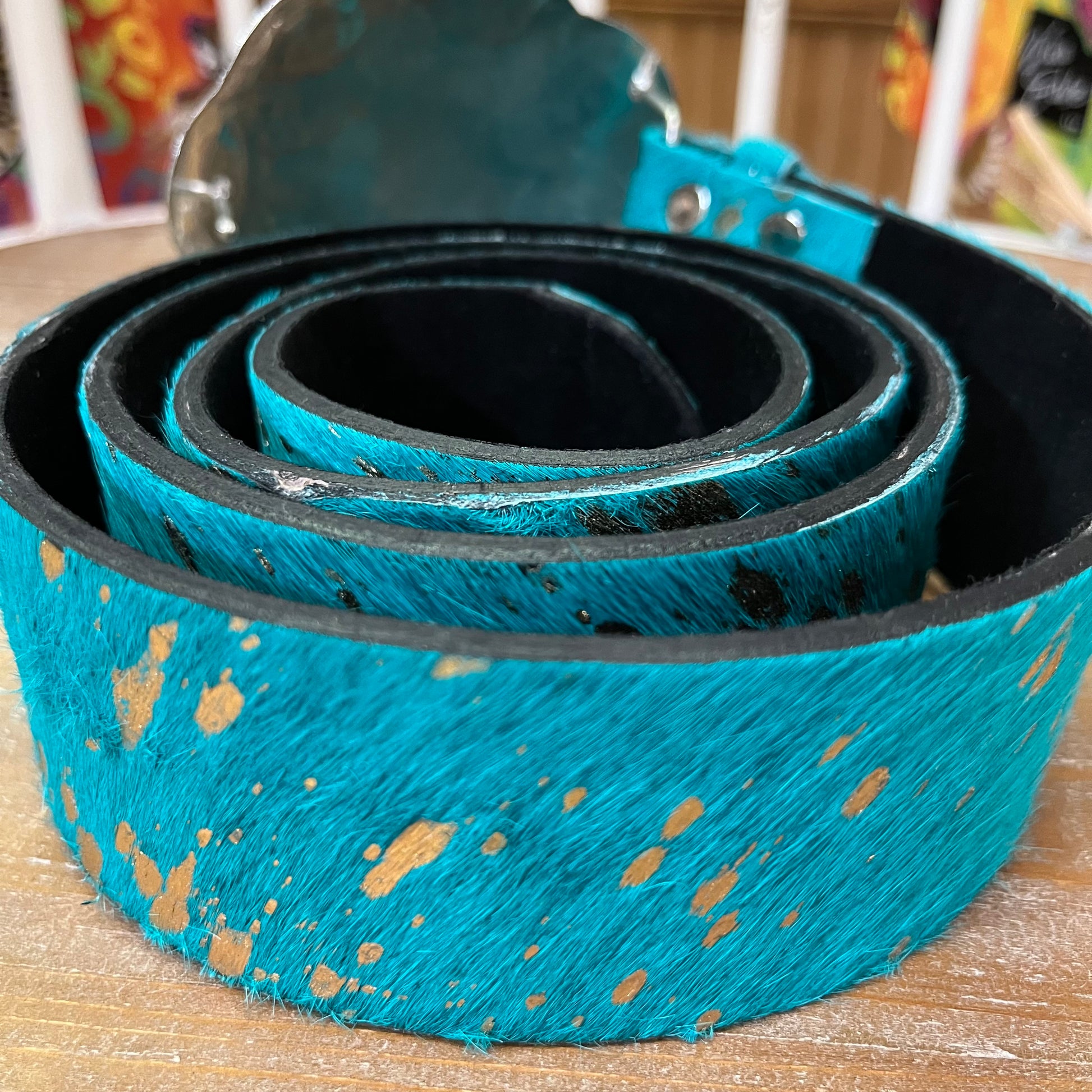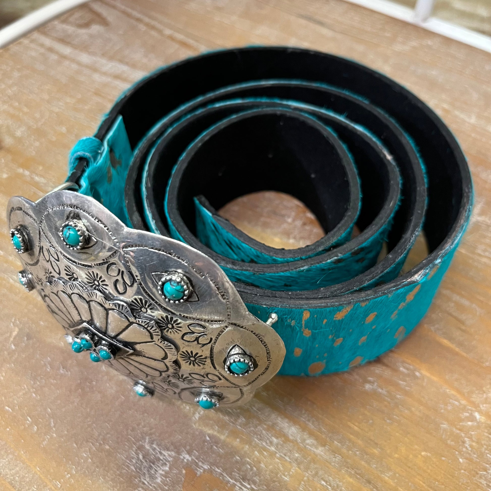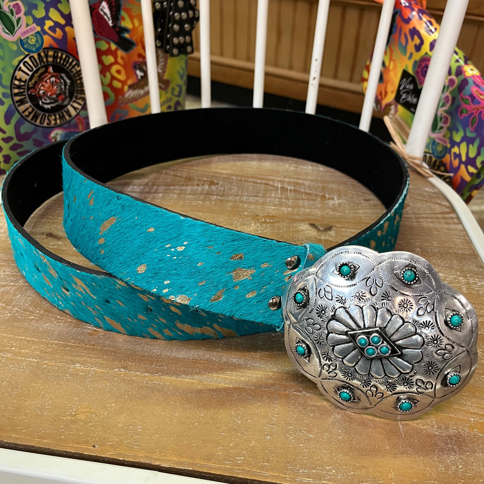 Turquoise hair on hide with gold accents