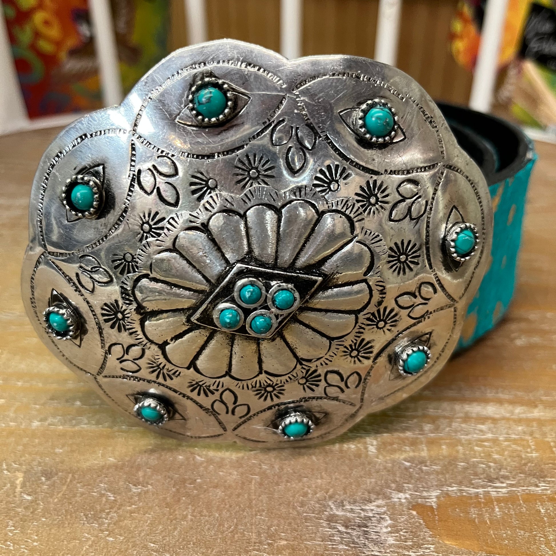 Concho silver buckle with faux turquoise stones