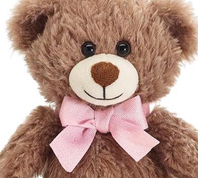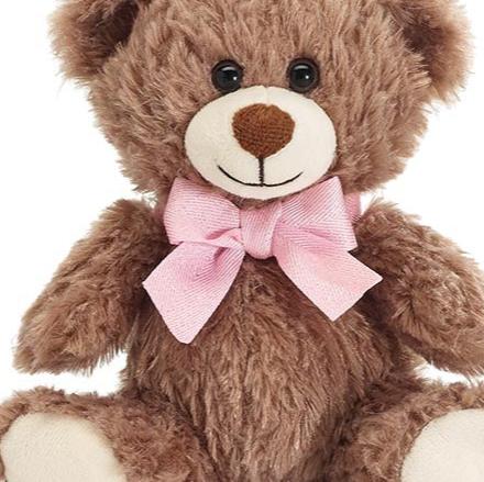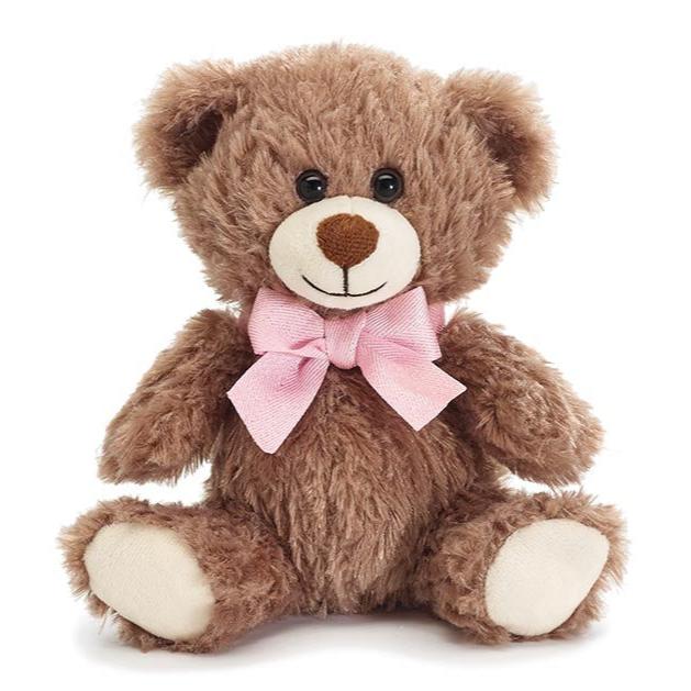 7" soft wavy furred brown bear with brown nose and soft pink ribbon bow tied around its neck.