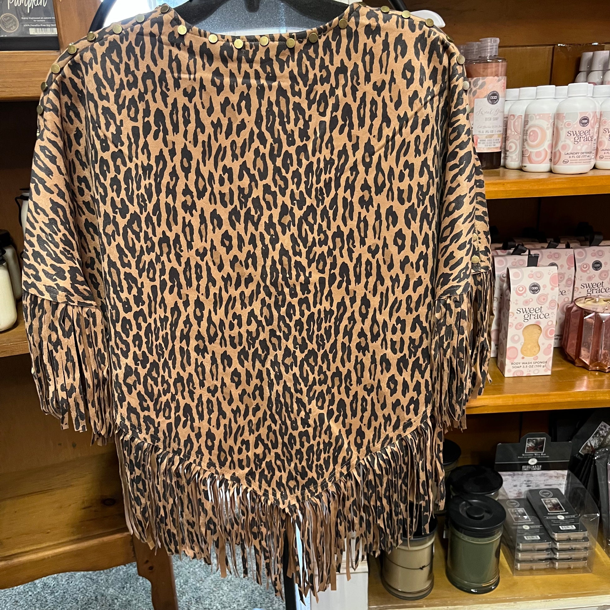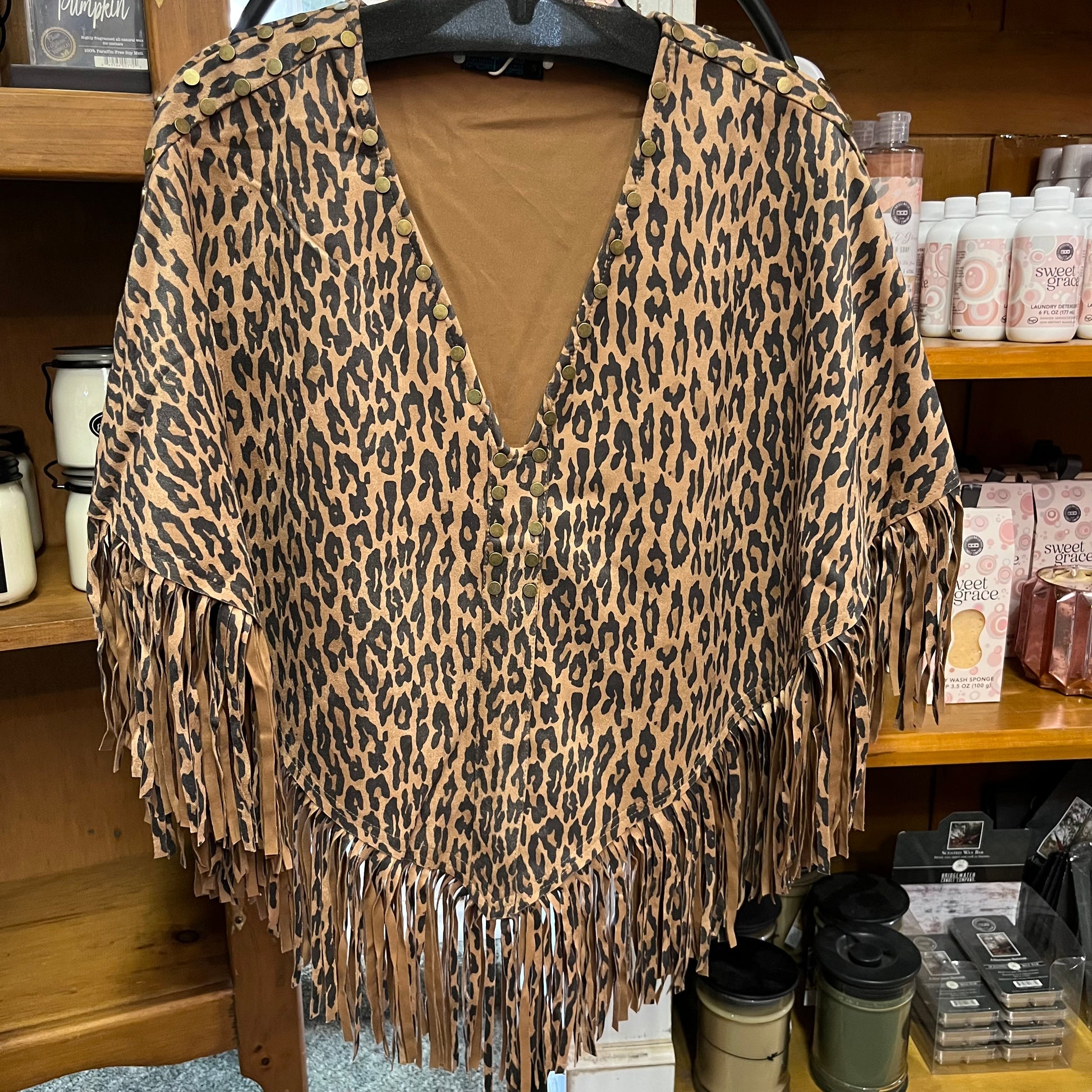 - SHOW YOUR WILD STYLE Fashionably chic poncho features leopard print with studded detail and fringe trim. The bias-cut highlights its sumptuous drape. Pullover poncho is a flattering top layer for any outfit.