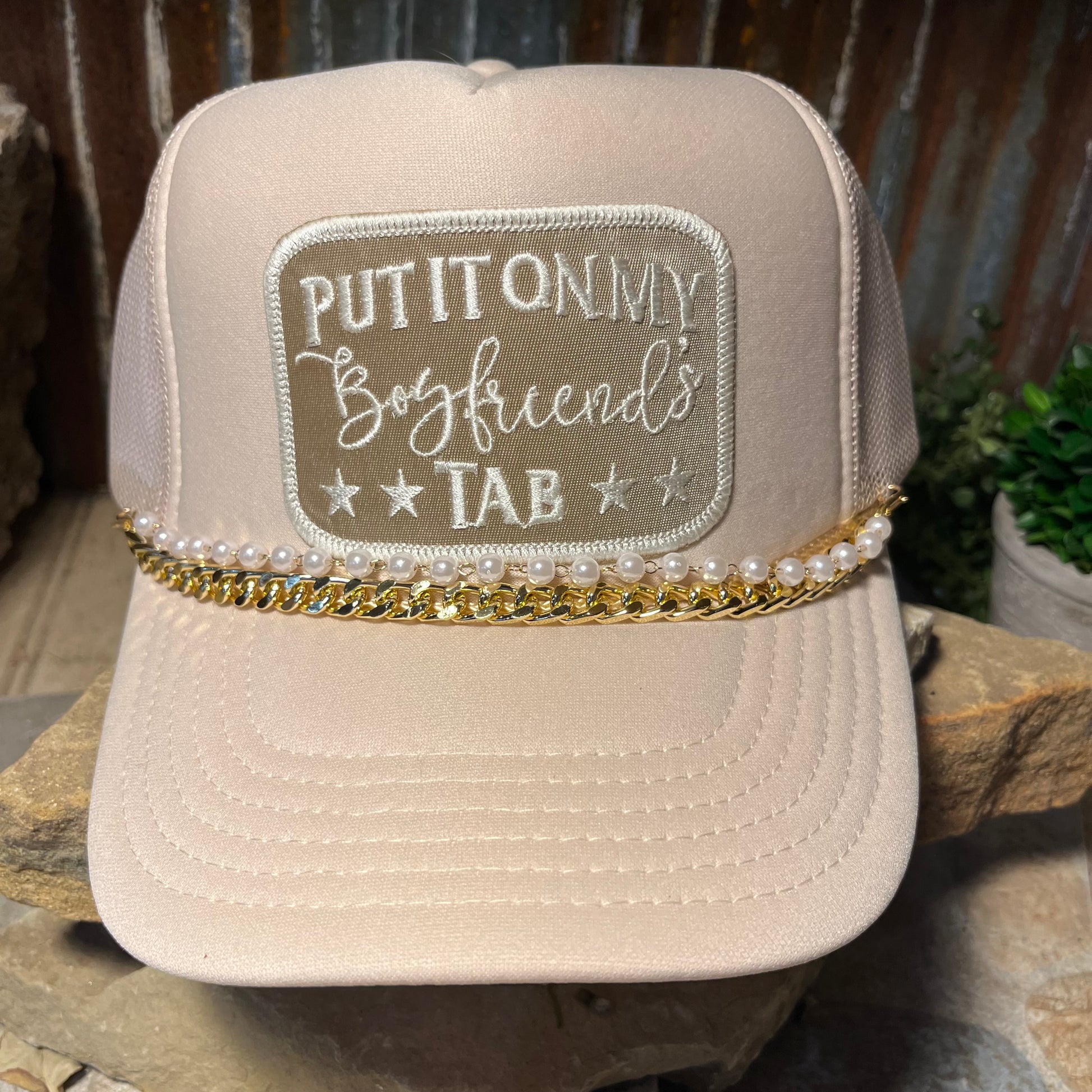 Put It on My Boyfriend's Tab – A guaranteed conversation starter, this embroidered patch trucker hat brings humor and sass your customers will love. With its playful message and trendy design, it’s perfect for boutiques that cater to women who appreciate a little sarcasm and a lot of style. Whether it's for girls' trips, shopping days, or just everyday fun, this hat is an easy upsell and a great gift item. Stock it in your shop and watch it fly off the shelves—because everyone knows someone who needs this hat. Features • High quality embroidered patch designed and embroidered in house by us. • Breathable mesh back for comfort • Adjustable snap back closure for a perfect fit • Light weight for all day comfort