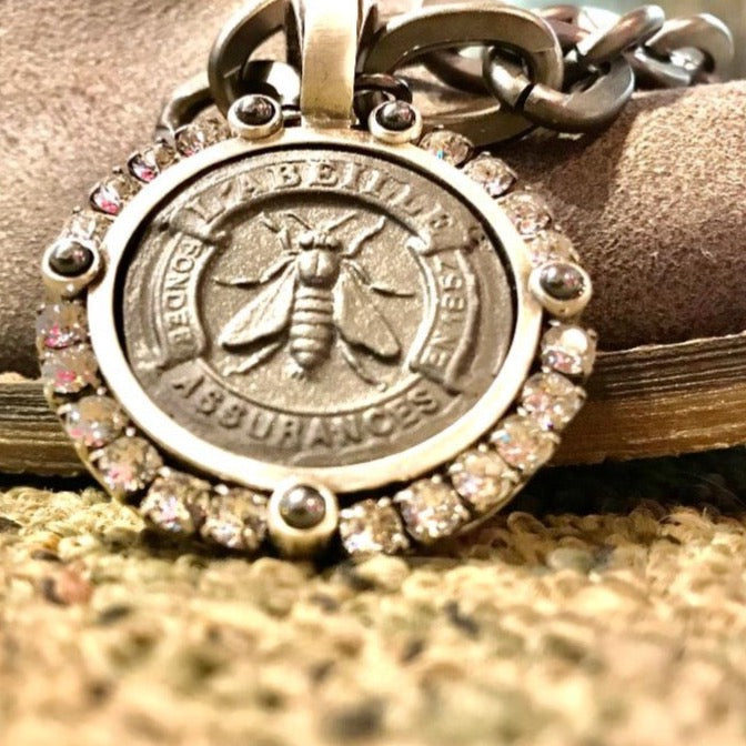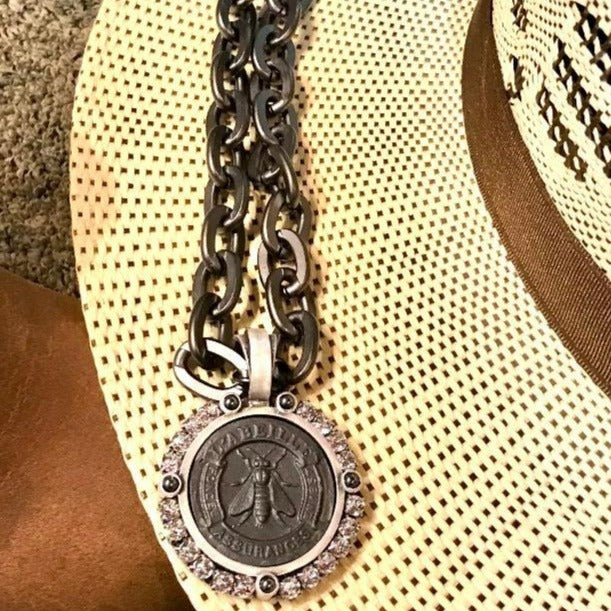 - FK Necklace Rhodium Lourdes Chain Brillante Bezel Hematite Cabs and Rhodium Abeille Medallion