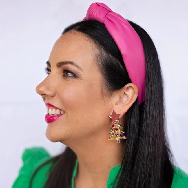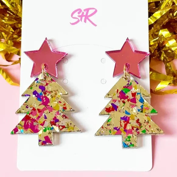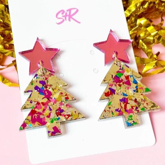 Our Acrylic Christmas Tree With A Gold Confetti Tree and A Pink Mirrored Star Topper.