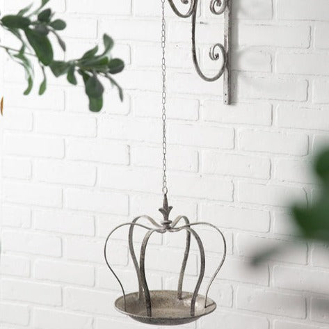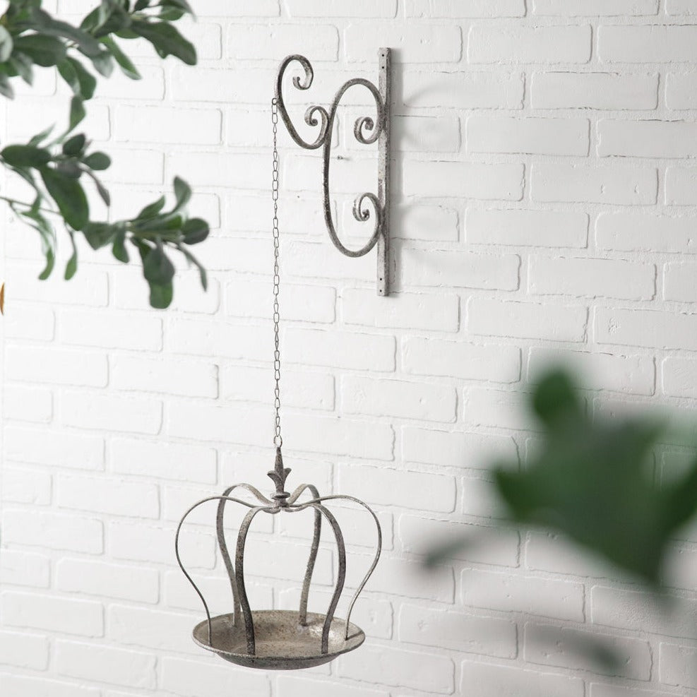 Welcome your feathery friends with regality by displaying our Hanging Crown Feeder outdoors. This item is crafted from metal and is one connected piece. The crown measures 12¼''H. To hang, use its four screw holes. to hang securely
