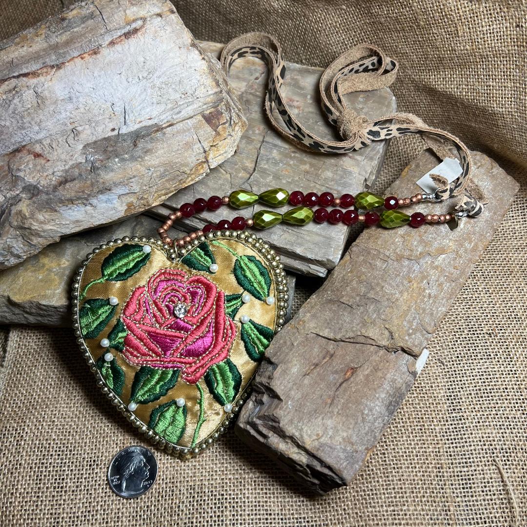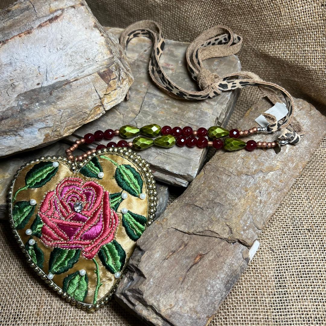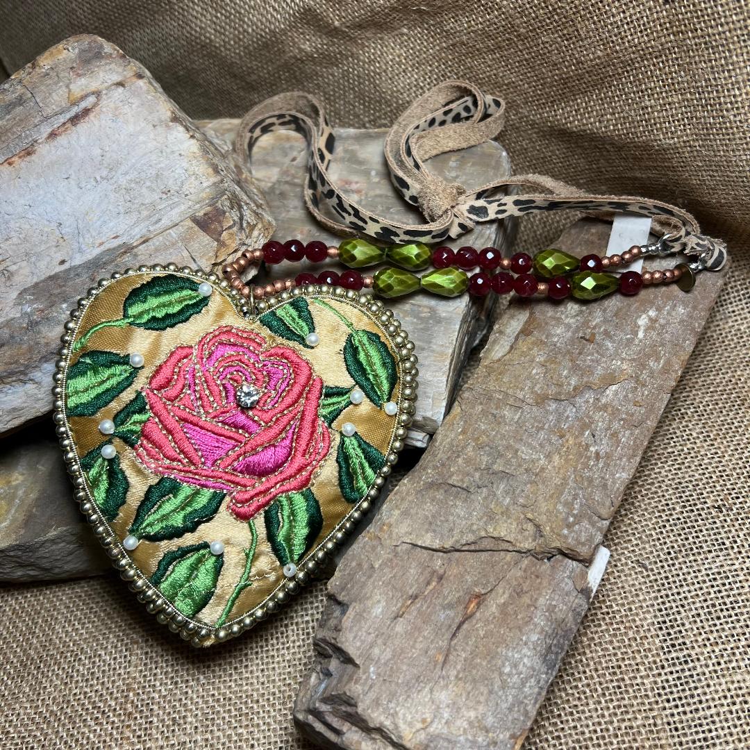 Embroidered rose garden on this golden satin heart makes quite a statement. Pretty small golden beads surround the outer edge and are extended with sparkle beads and leather to make an adjustable necklace. stunning.