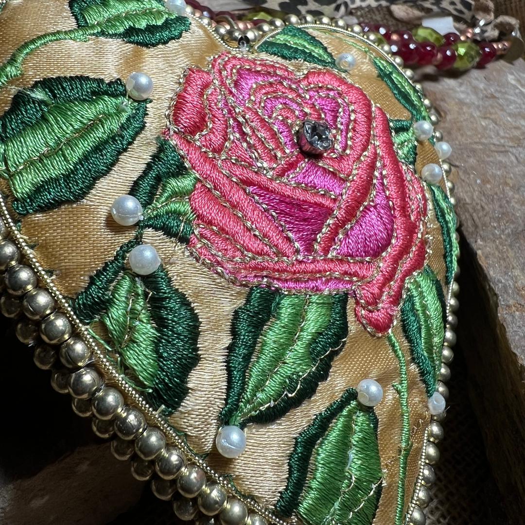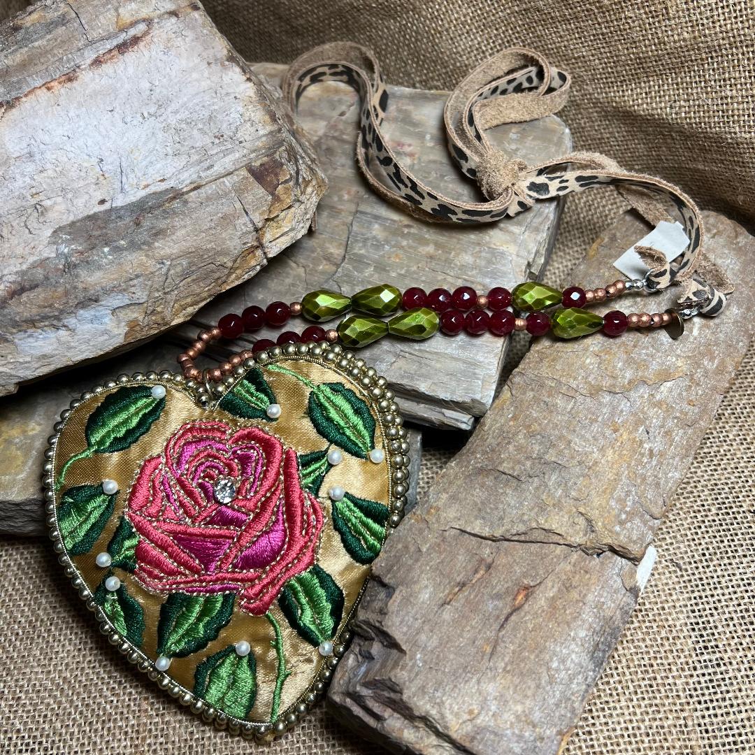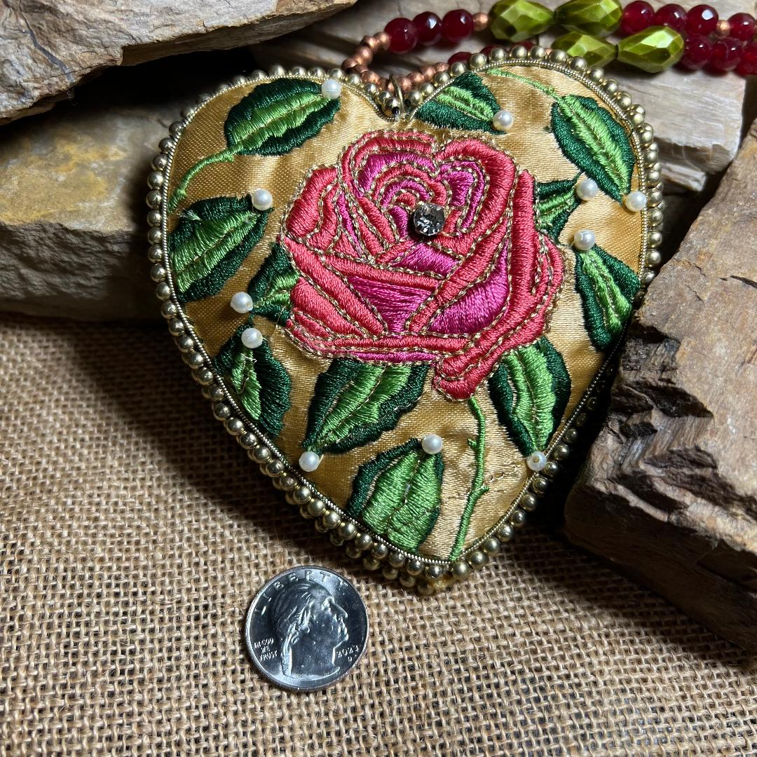 Embroidered rose garden on this golden satin heart makes quite a statement. Pretty small golden beads surround the outer edge and are extended with sparkle beads and leather to make an adjustable necklace. stunning.