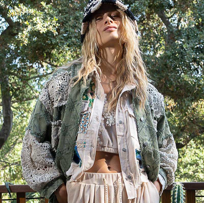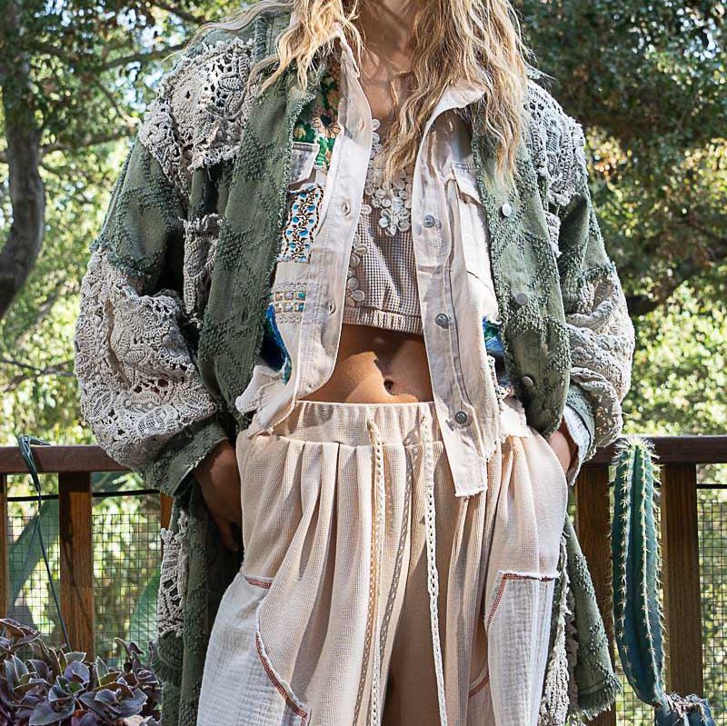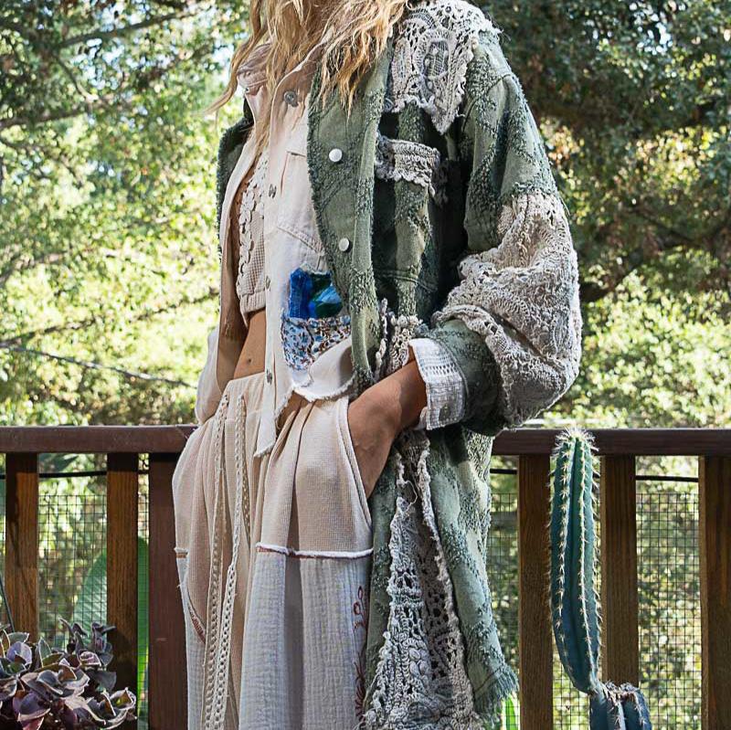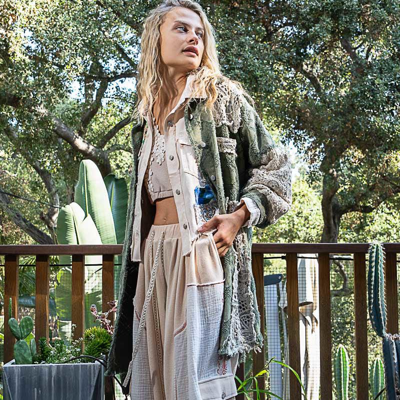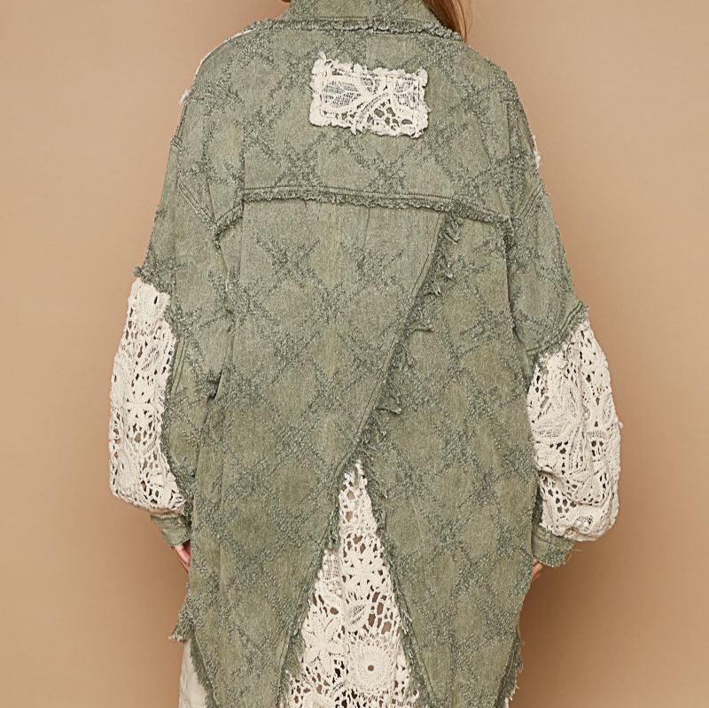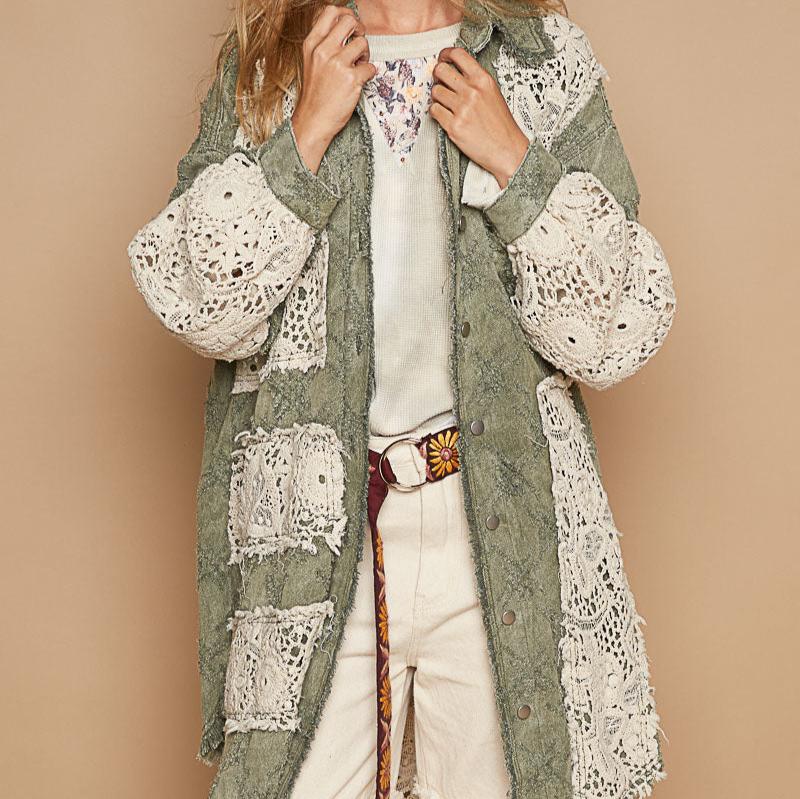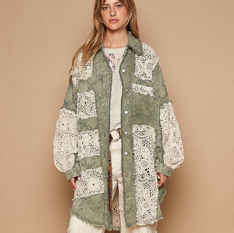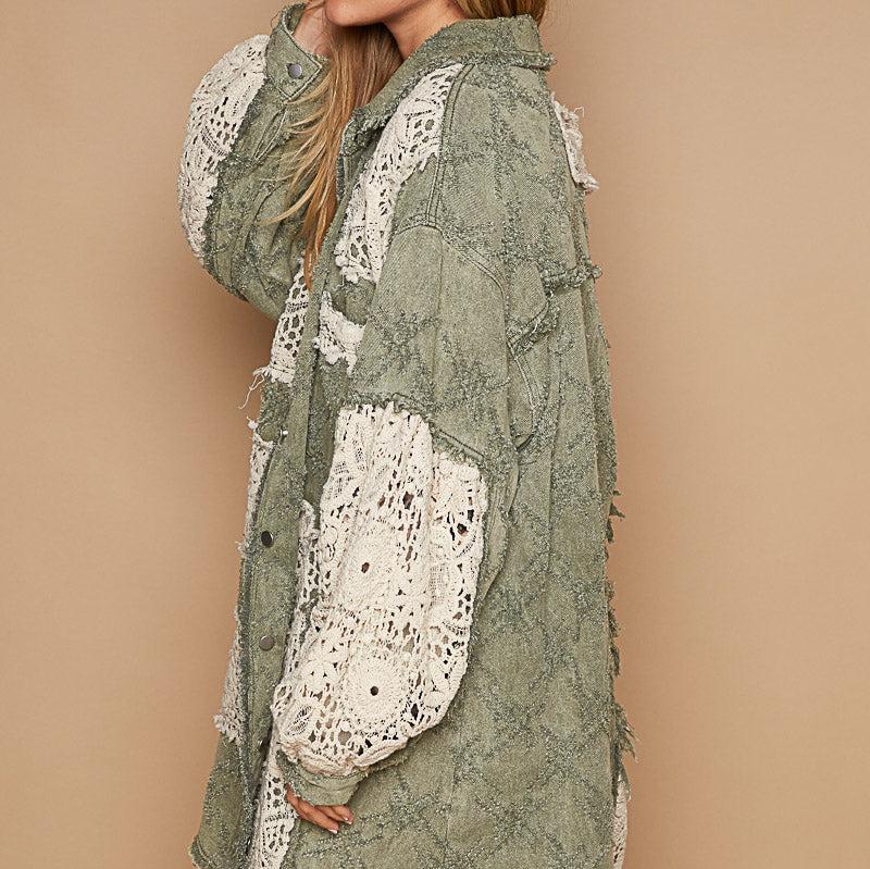 Designed in long sleeve roomy fit shacket in textured twill with out seam, raw edge, crochet patch, vintage washing, solid color.