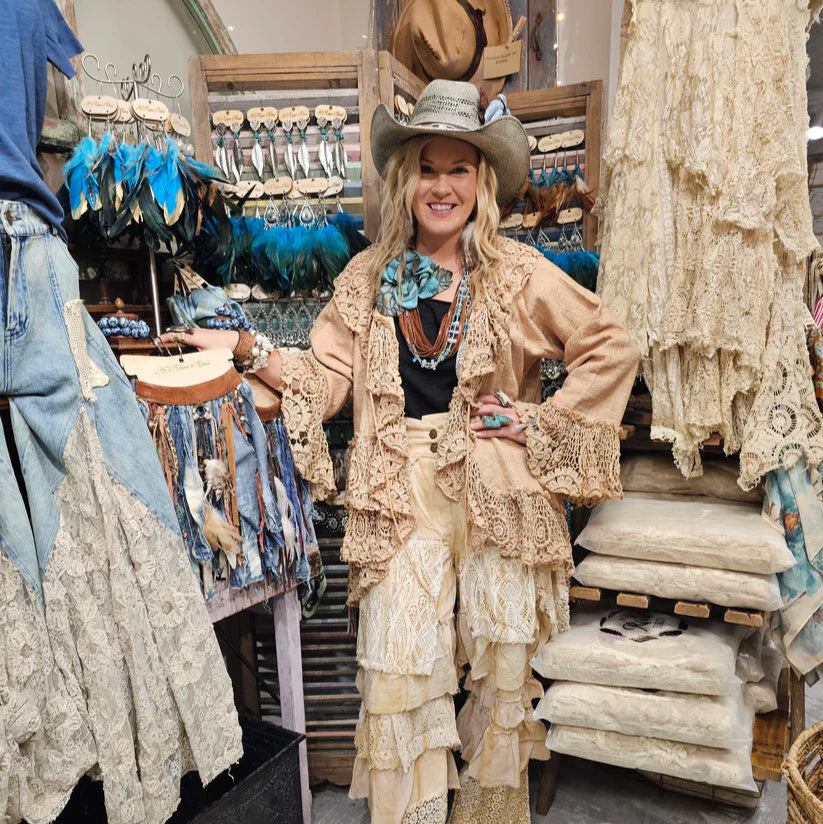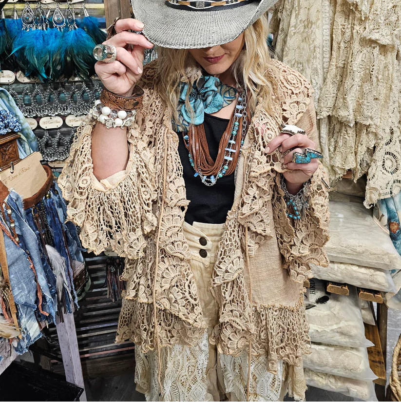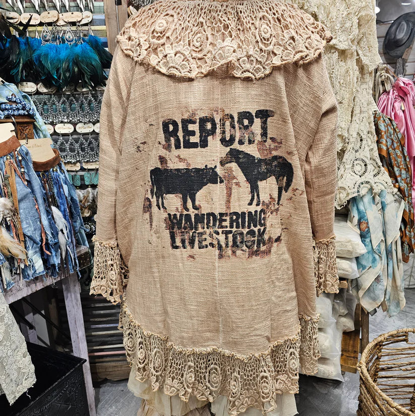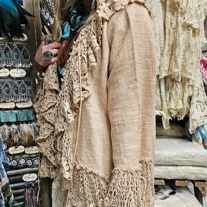 OMG! This one of a kind soft to the touch burlap jacket is so incredible. The distressed WANDERING LIVESTOCK on the back create such a fun vibe! Pairs well with all of the RARE BIRD pants and jeans. Beautiful one size top can be tied in the front or worn loose. Pairs over our Lace dress. lace inset jeans....and well...just everything we have! Perfect wardrobe piece.