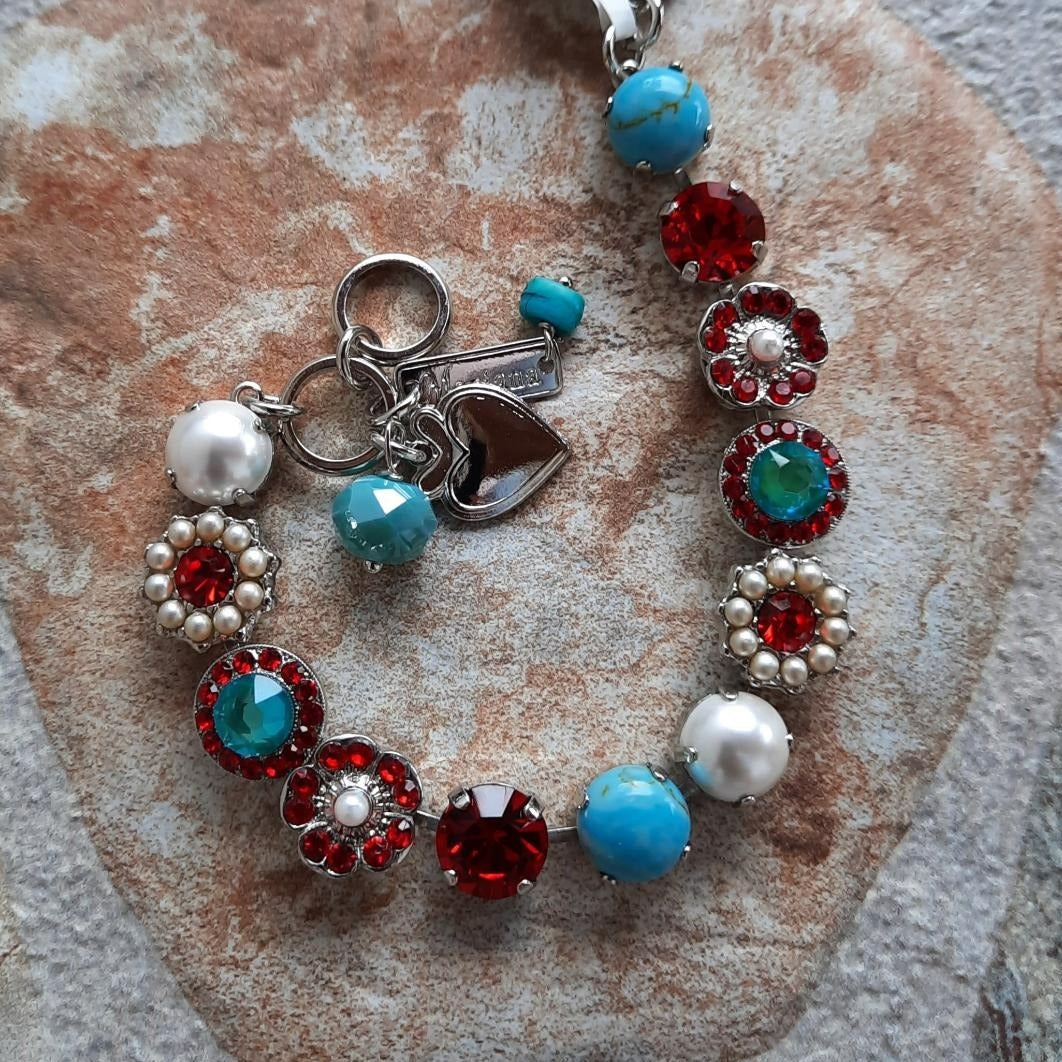 Round bracelet, hand set with 12 unique, high quality crystals and elements. 6 10mm round crystals and 6 cluster and flower elements. Includes 3 charms: polished heart, small briolette, and Mariana branded tag.