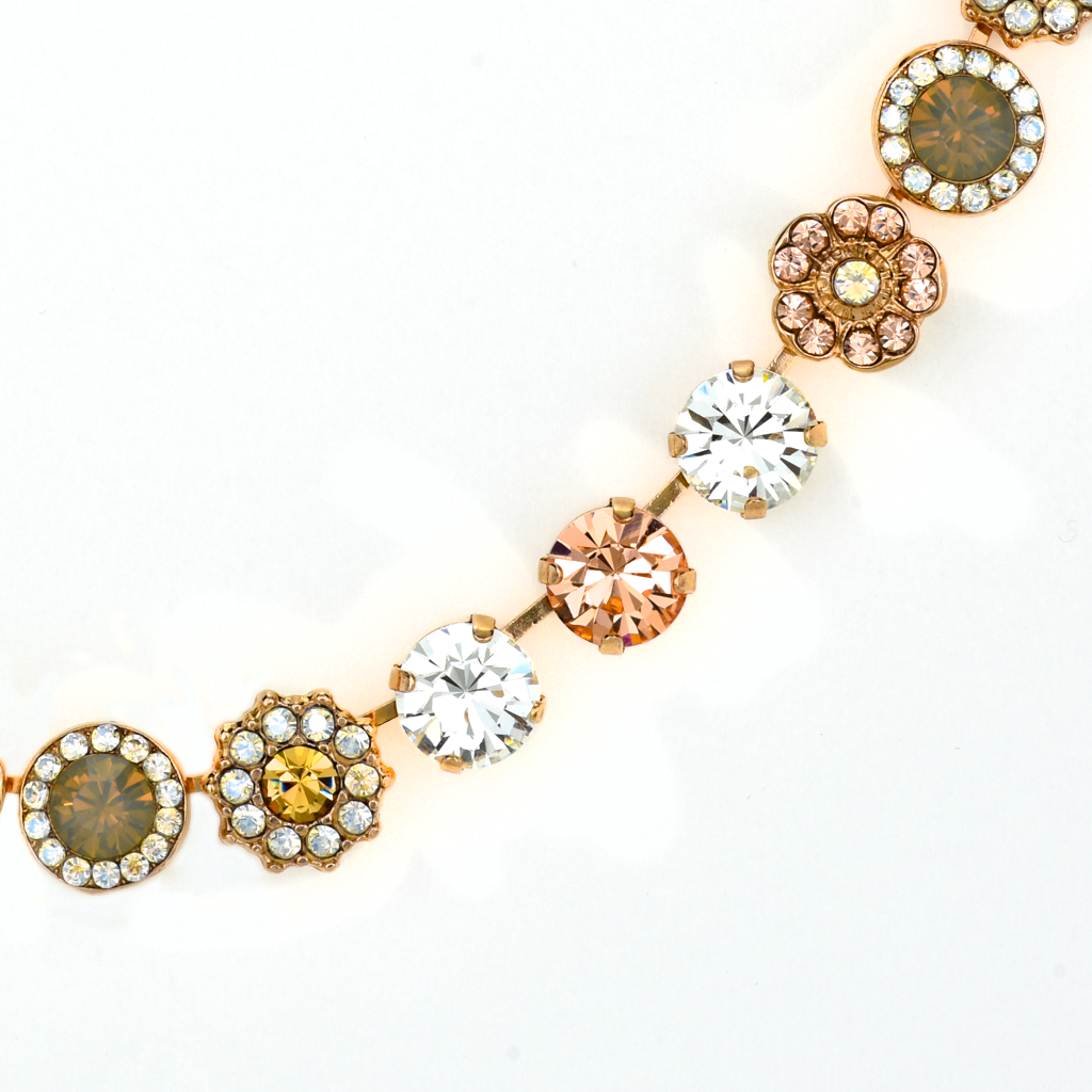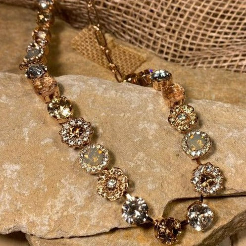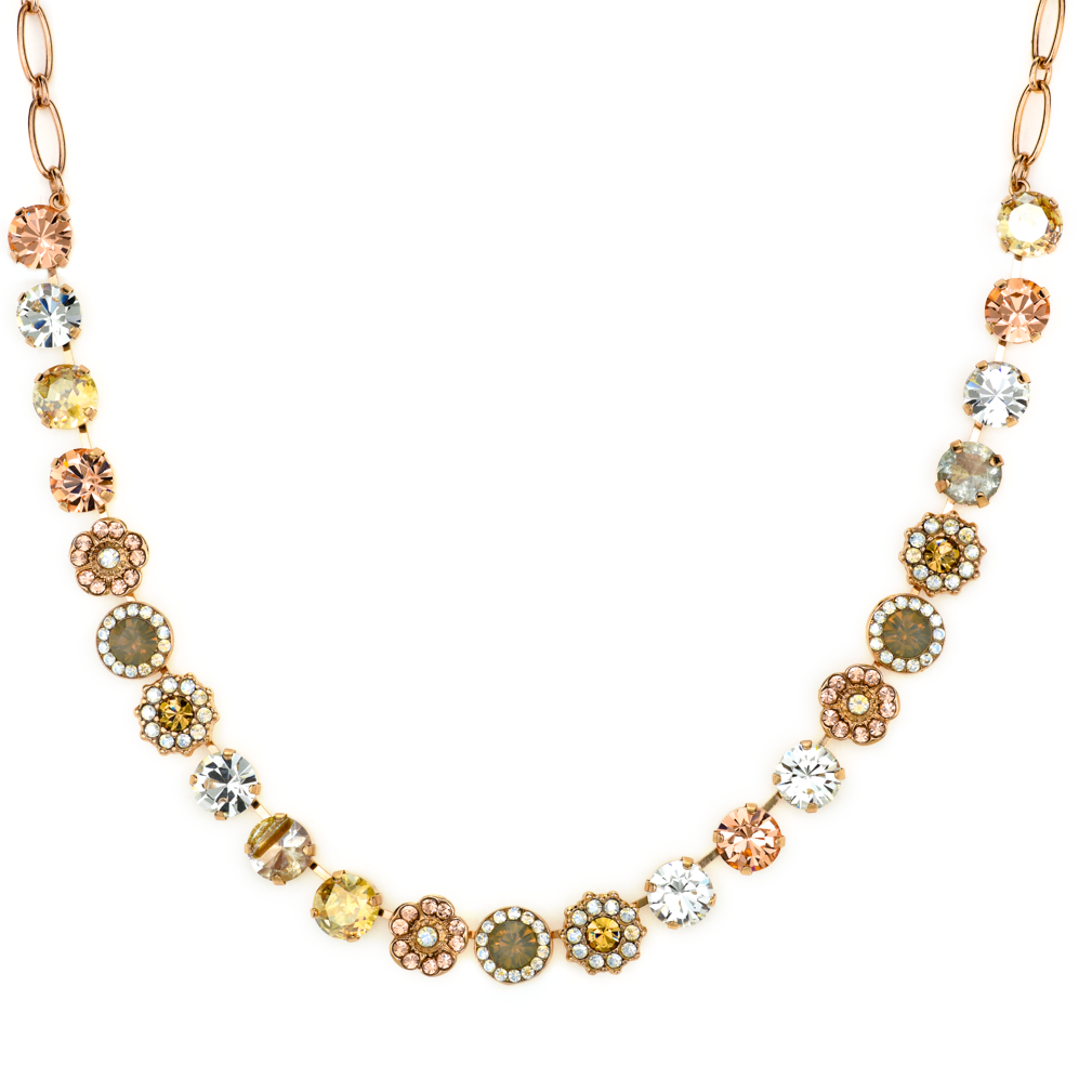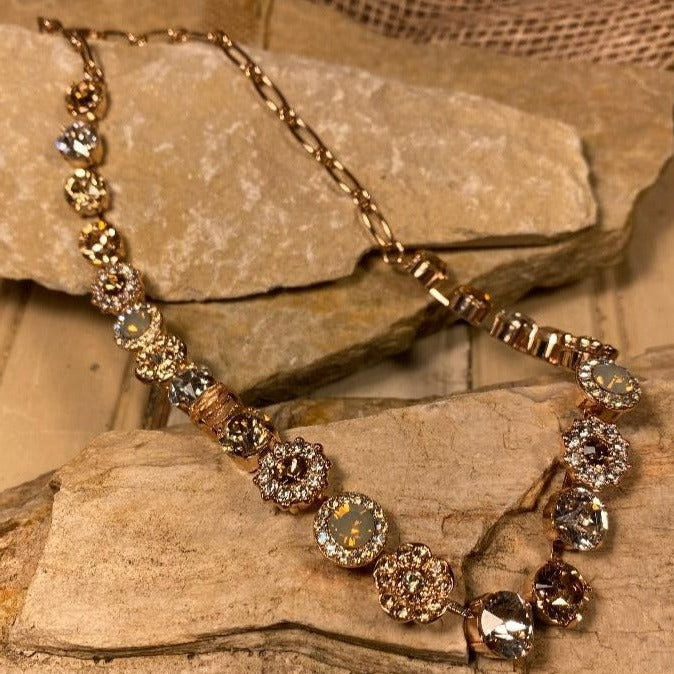- Round necklace, handset with 23 10mm unique, high-quality Crystals, minerals, and elements. 14 round and 9 flower and cluster elements. Includes Mariana branded tag.