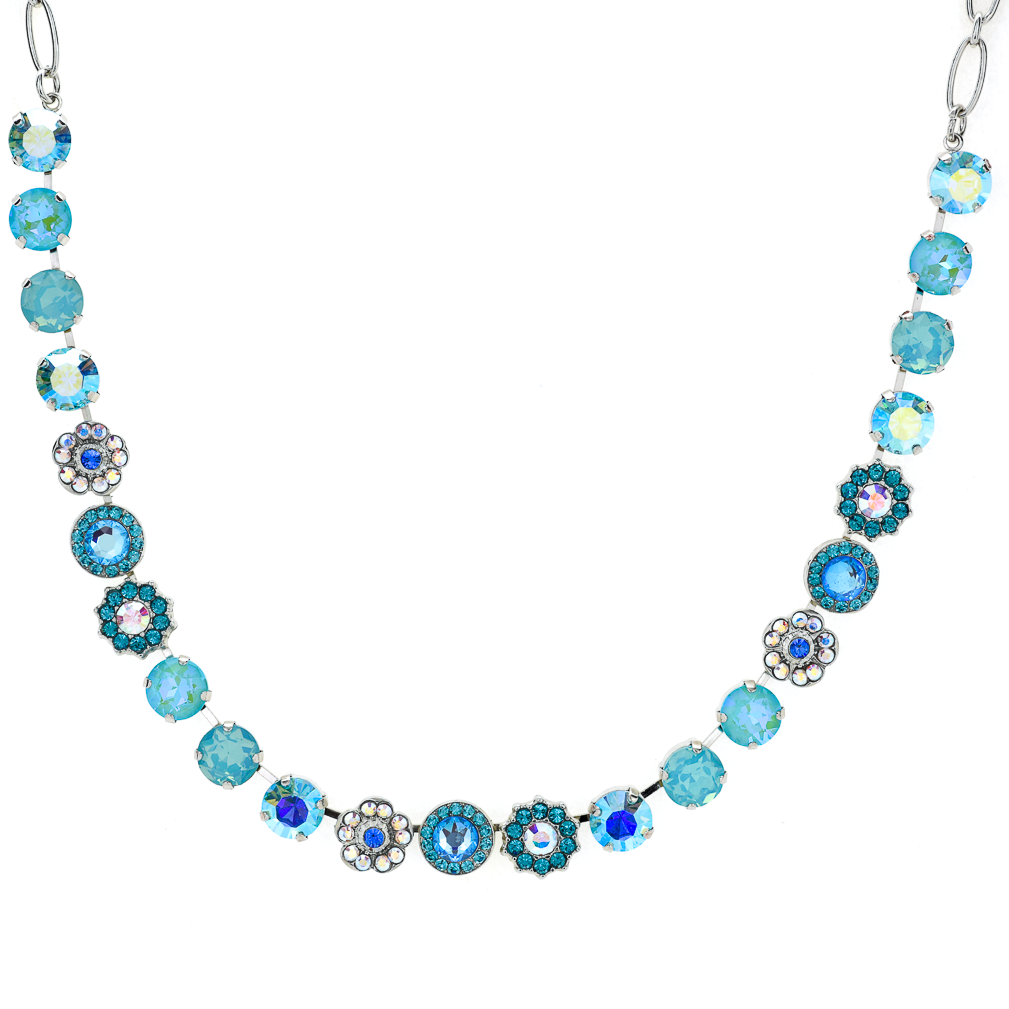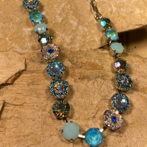 - Round necklace, hand set with 23 10mm unique, high-quality Crystals and elements. 14 round (2 natural turquoise) and 9 flower and cluster elements. Includes Mariana branded tag.