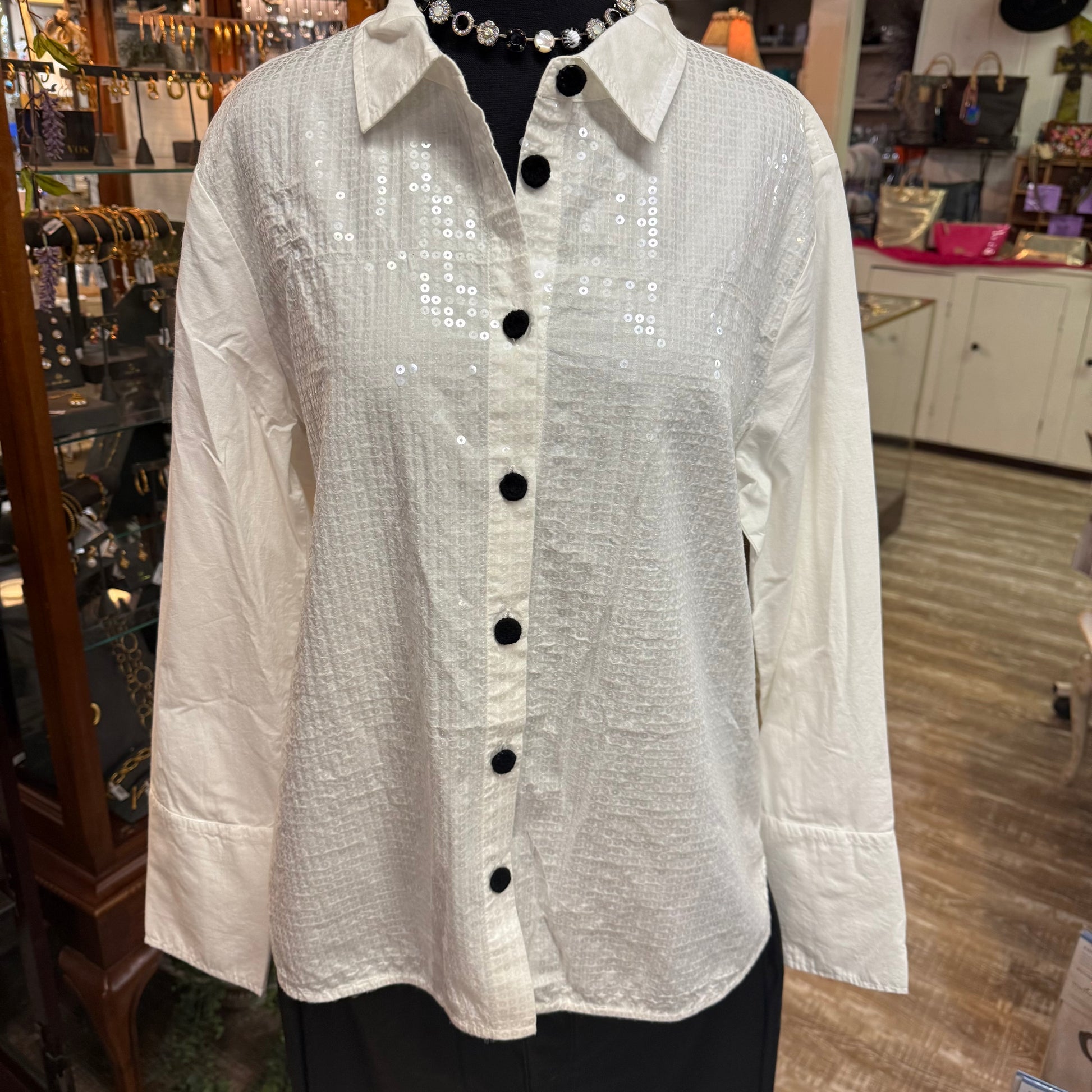 Shimmer meets sophistication in this sequin button up. Crafted from lightweight polyester, it drapes effortlessly while adding a subtle shine to any outfit. It's a versatile choice for both day and evening looks.