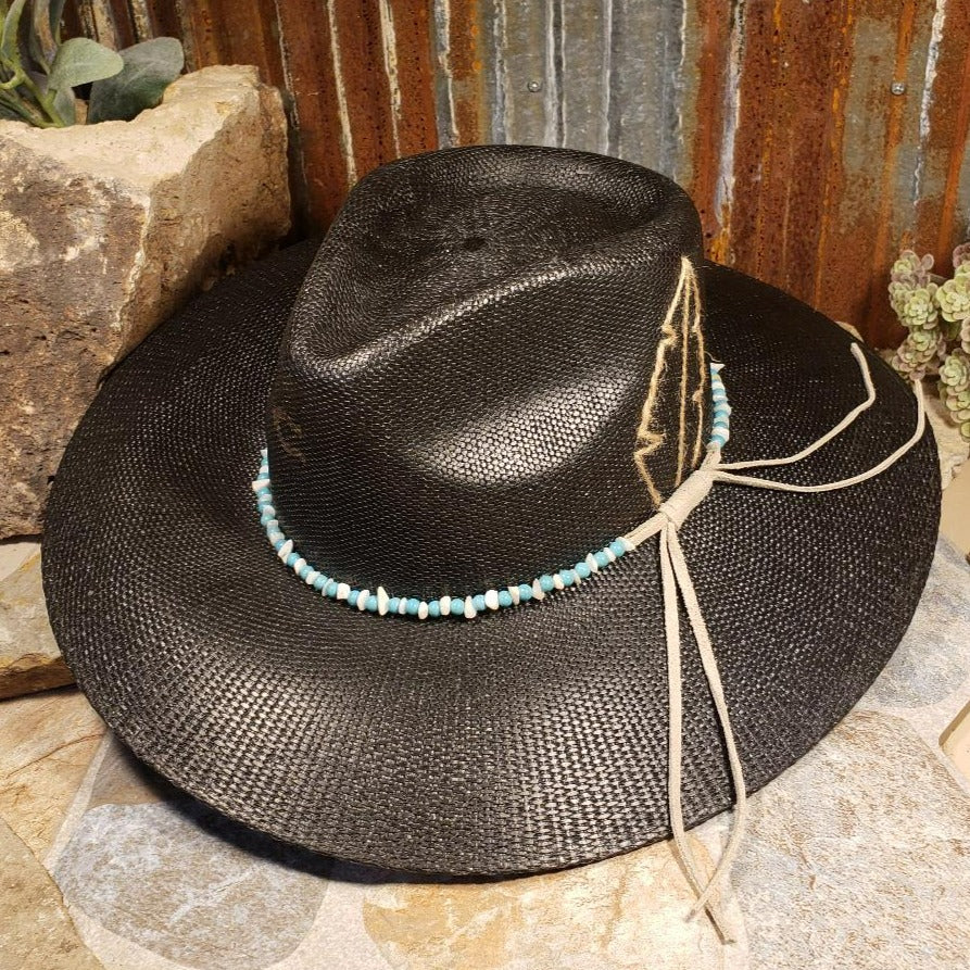 Be stylish and cute in this Charlie 1 Horse straw hat that features these beautiful white & turquoise beads & a nice, embedded leaf stitched in!