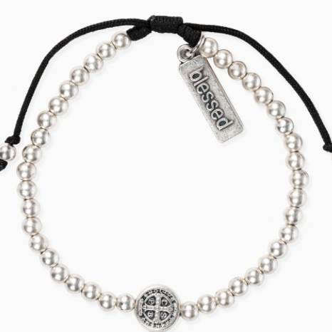 - Silver or gold-tone Benedictine Medal surrounded by silver or gold-tone beads and a "blessed" tag