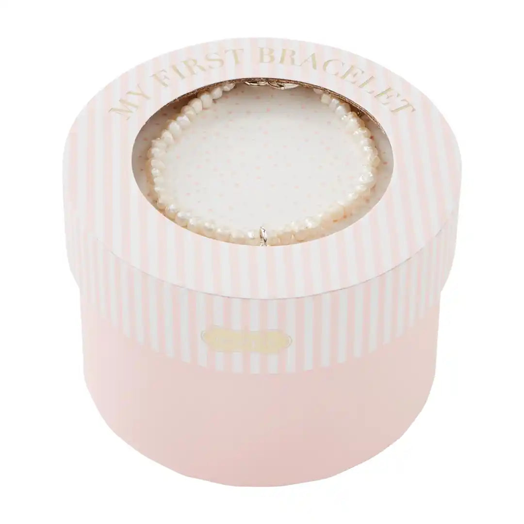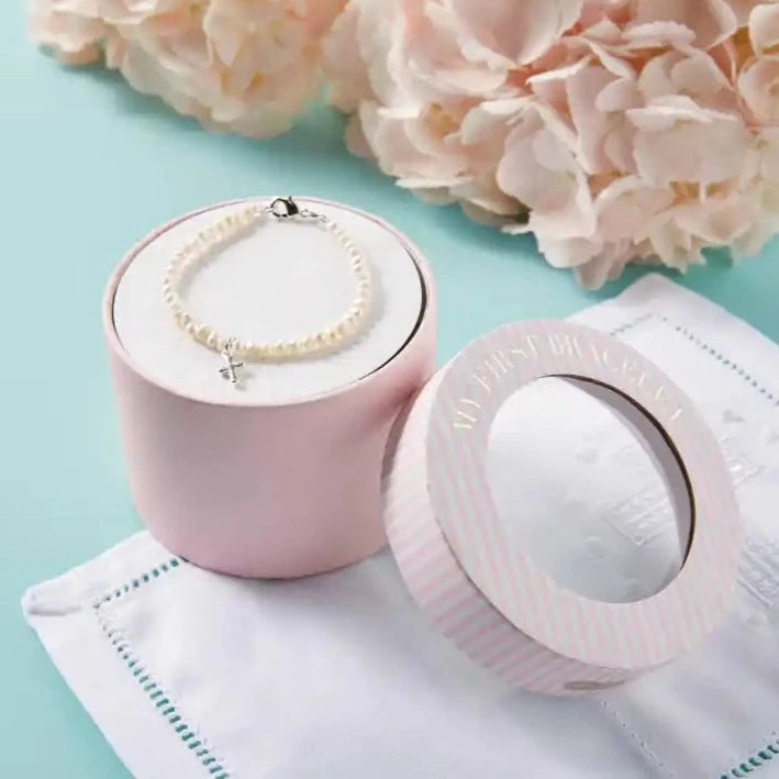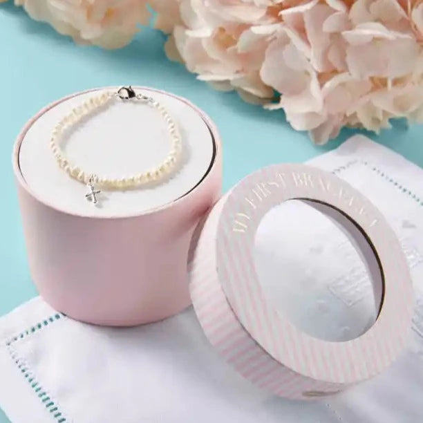Our My First Cross Bracelet makes a great gift for baby girls! This set comes with a pearl baby bracelet that features sterling silver cross pendant. The bracelet comes in a pink and white box. The box reads "My First Bracelet", which is great for storage once baby outgrows it.