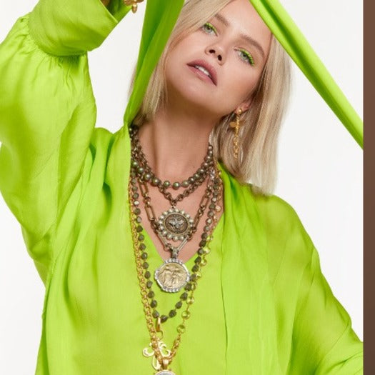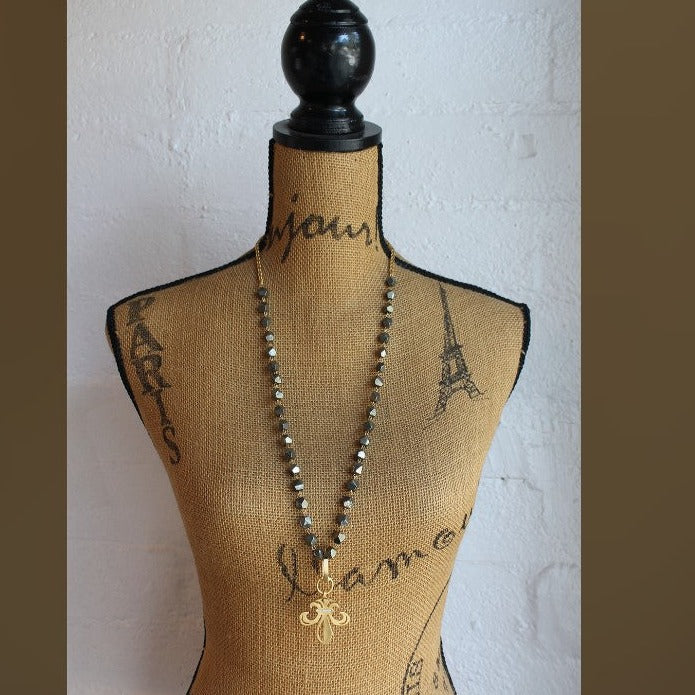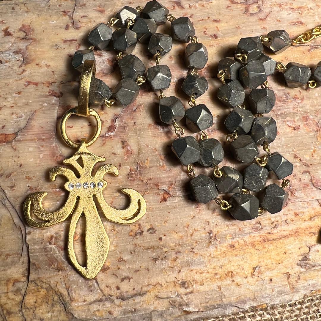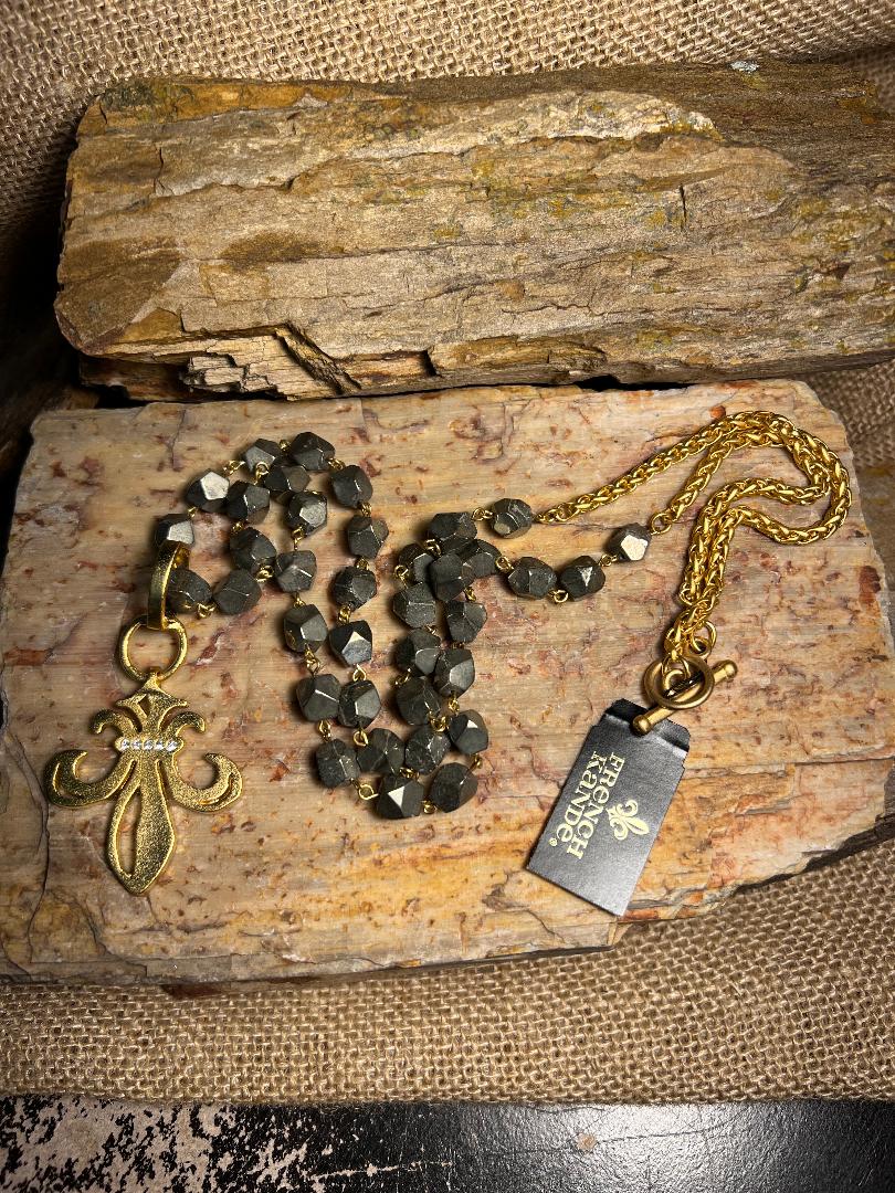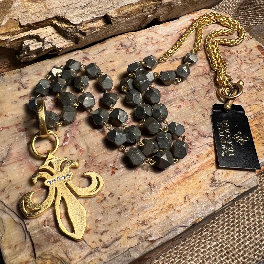 This necklace features 31” of faceted Pyrite with gold wire, petite Cheval chain and Grande Fleur pendant. Absolutely beautiful all by itself or layered with our other designs.