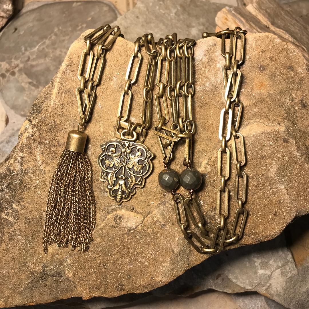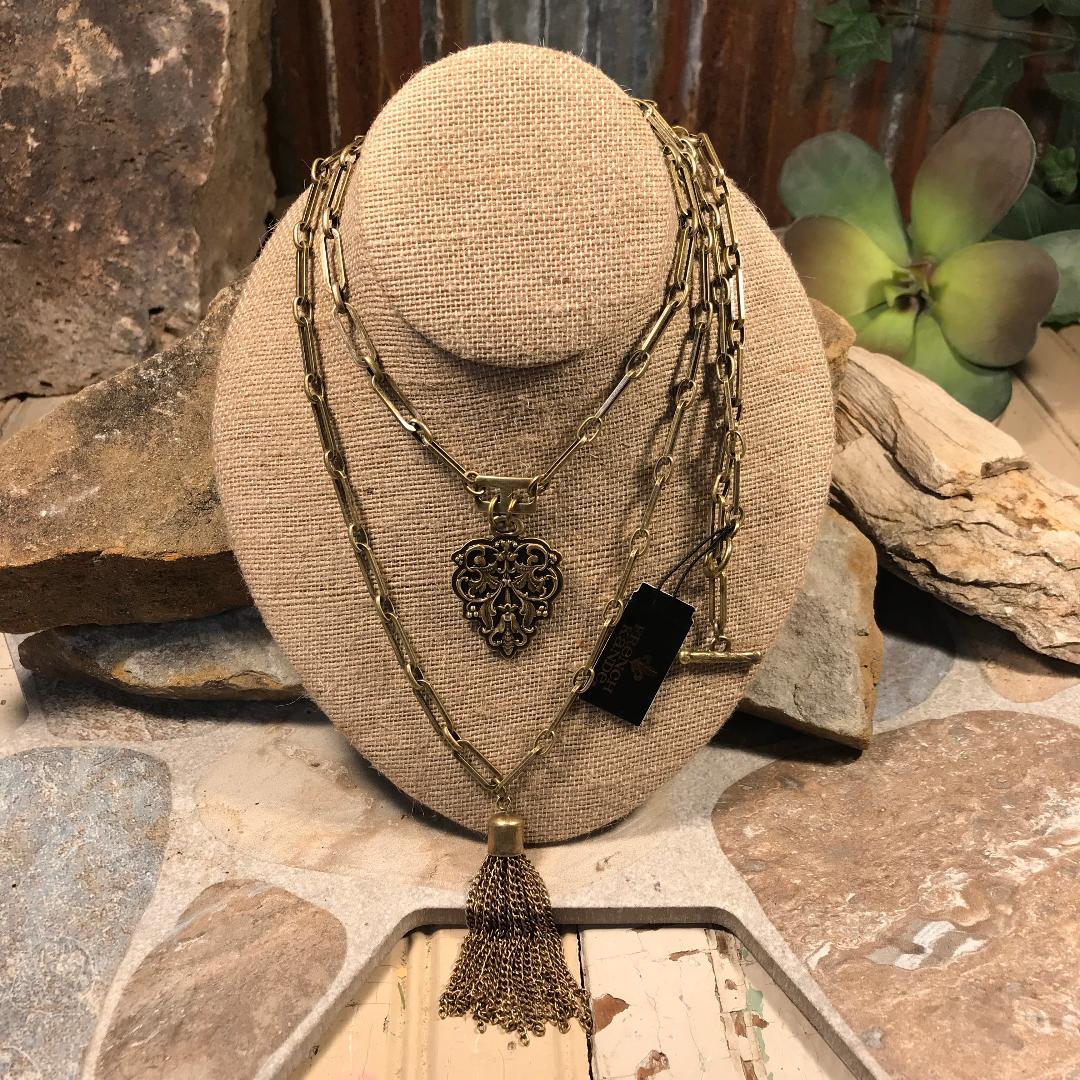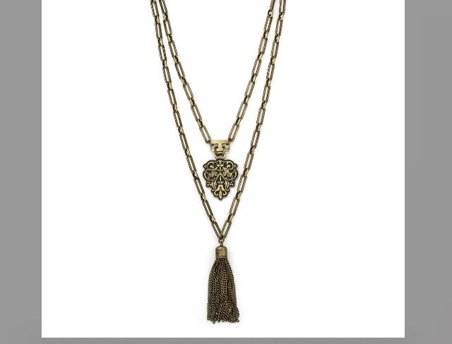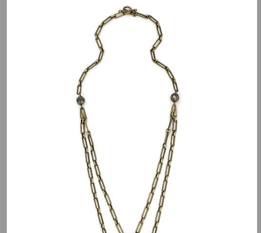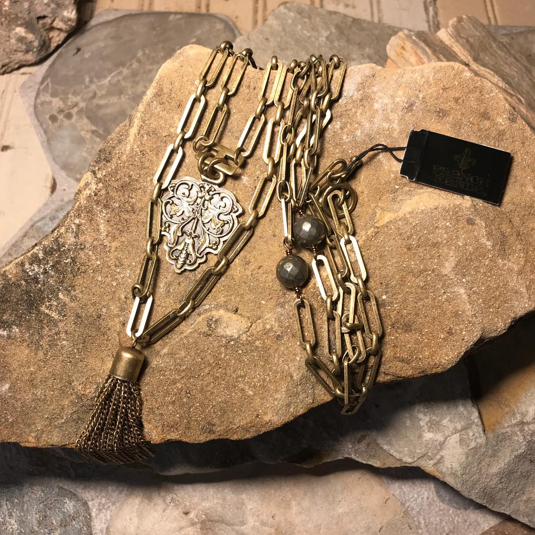This necklace features two 30-34” strands of our Versailles chain, Pyrite and H Chain accents, Filigrane pendant and small tassel. Absolutely beautiful all by itself or layered with our other designs.
