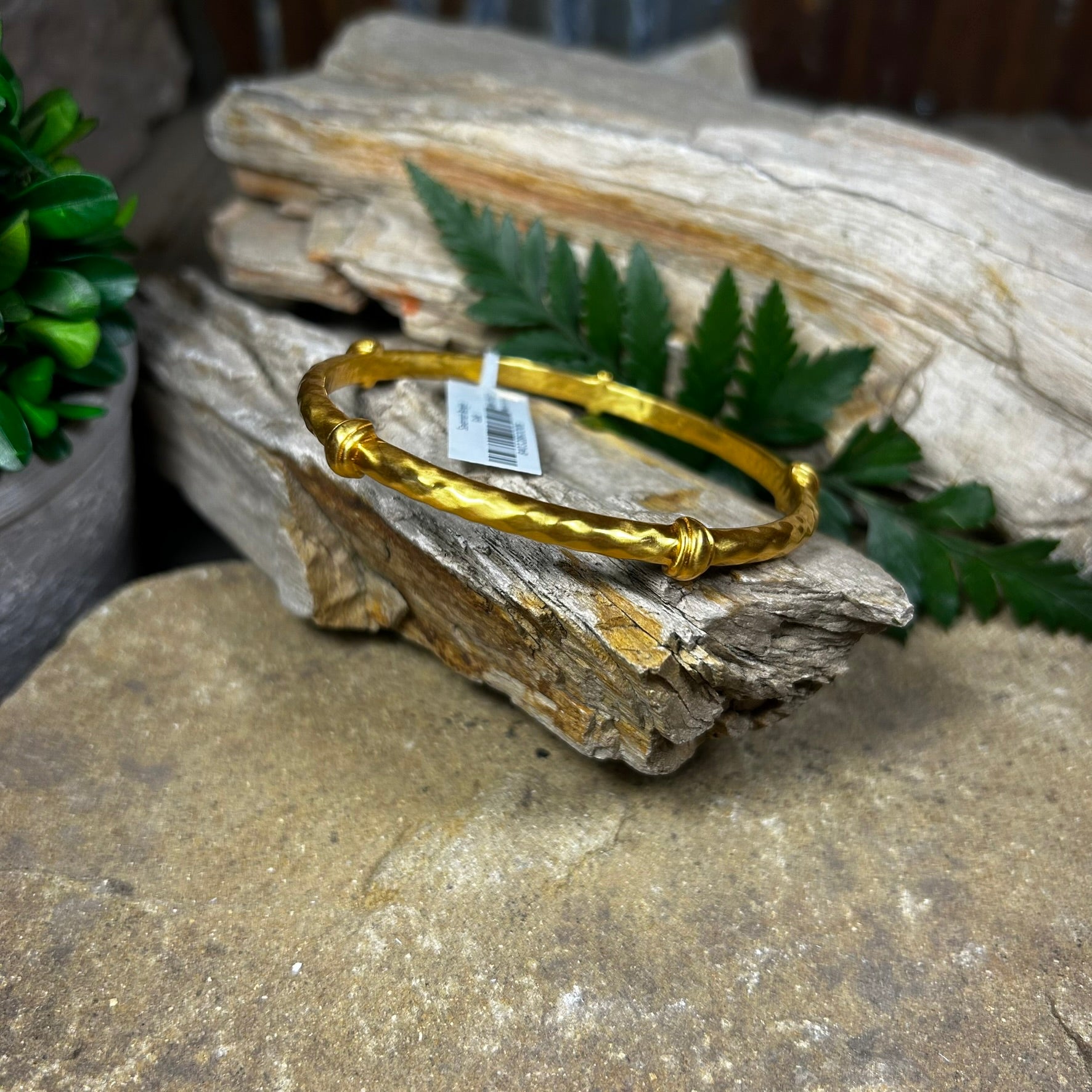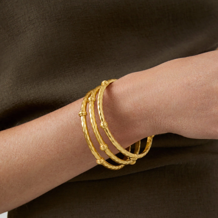 This Julie Vos Savannah Bangle features a gilded bangle with diamond hammering and decorative stations.