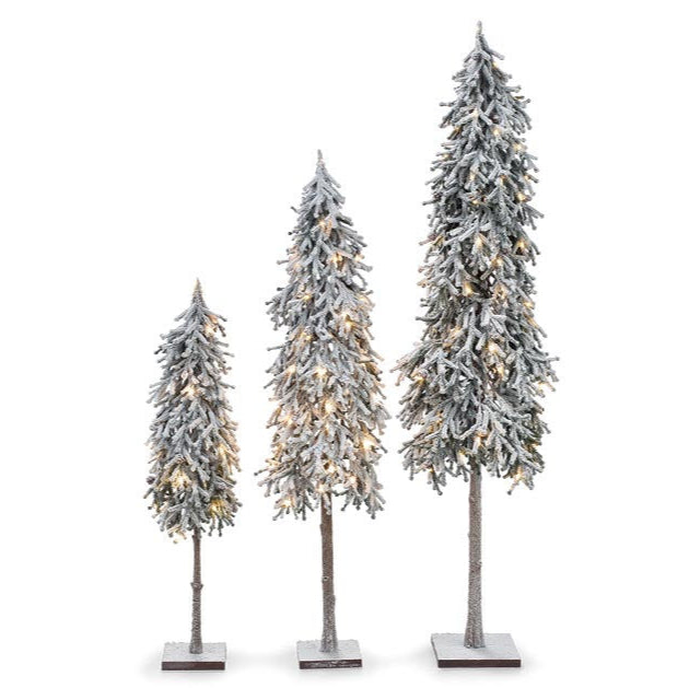 3 varied sizes of white flocked trees that light up, all come on a plastic stand. Knock down packaging. Some assembly required. Electrical plug.