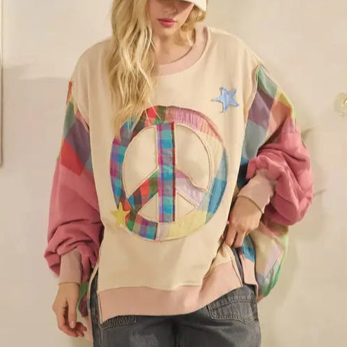 PATCHWORK PEACE SIGN PLAID SLEEVE SWEATSHIRT - COLORFUL PATCHWORK PEACE SIGN AND STAR APPLIQUES - MIXED PLAID AND SOLID COLORBLOCK SLEEVES - RELAXED OVERSIZED FIT WITH DROP SHOULDERS - RIBBED NECKLINE, CUFFS, AND HEM - MID-WEIGHT, SOFT BRUSHED FEEL Designed with a bold, multi-color plaid peace sign and star appliques front and center, this pullover adds a playful twist to your casual look. The mixed plaid and solid color block sleeves keep things fun and unique.