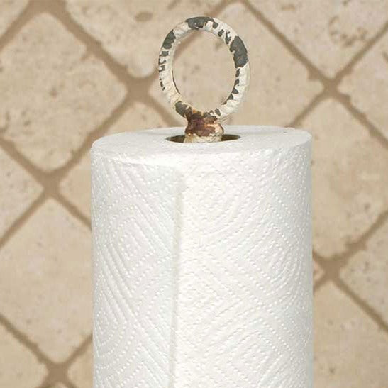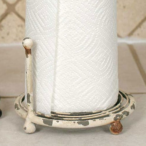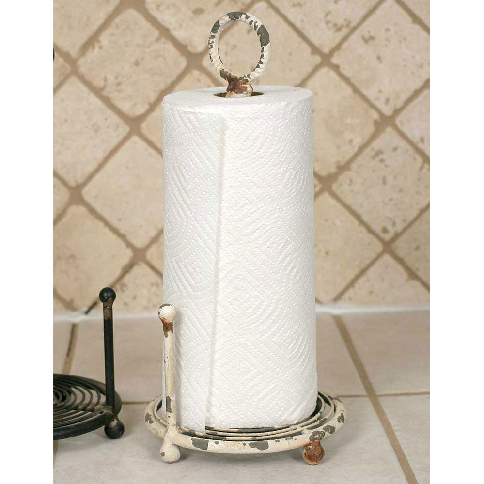 This cream-colored paper towel holder features a removable rod in the middle to hold paper towels. Measures 7'' diameter and 15'' tall. Will accommodate standard or jumbo rolls. Paper towels not included.