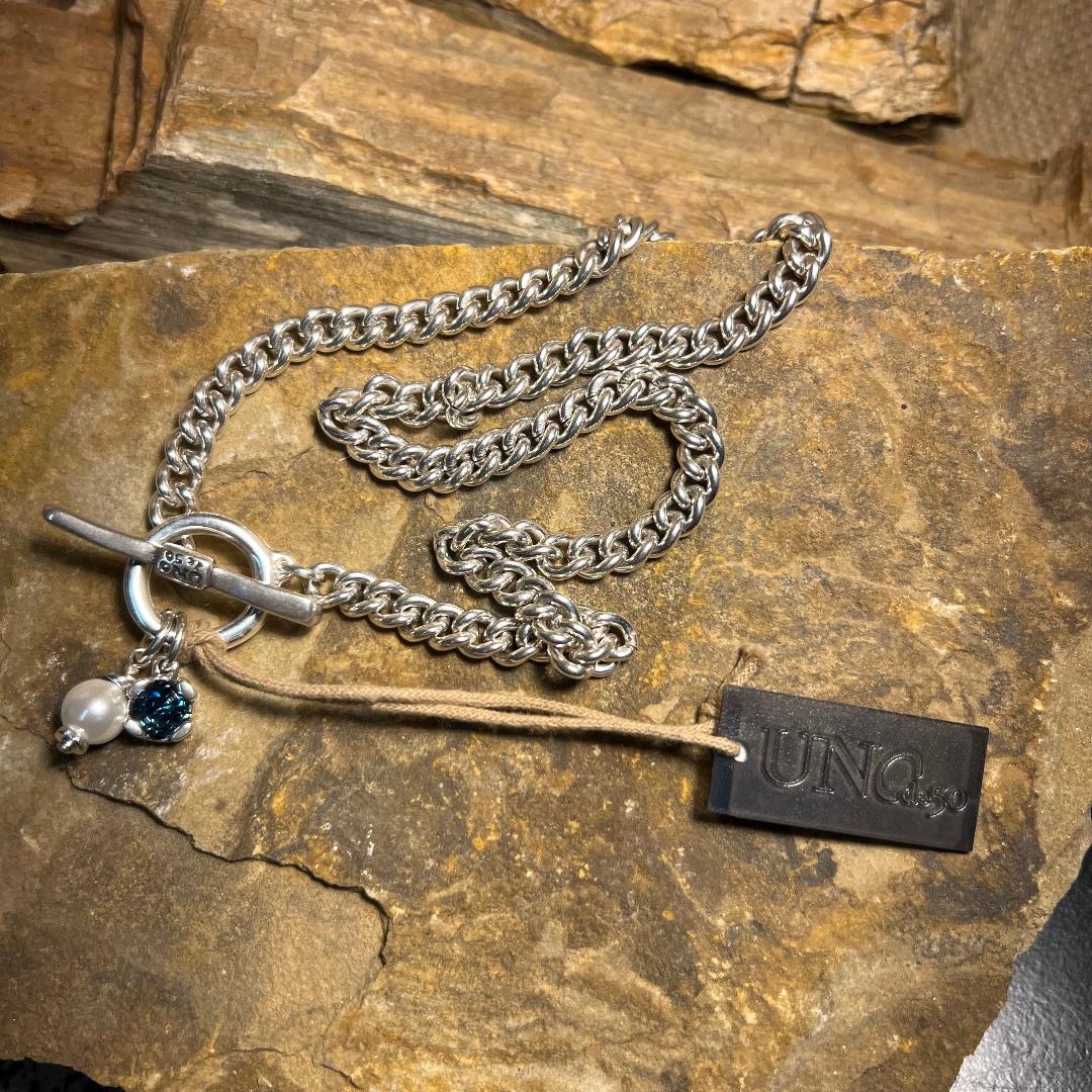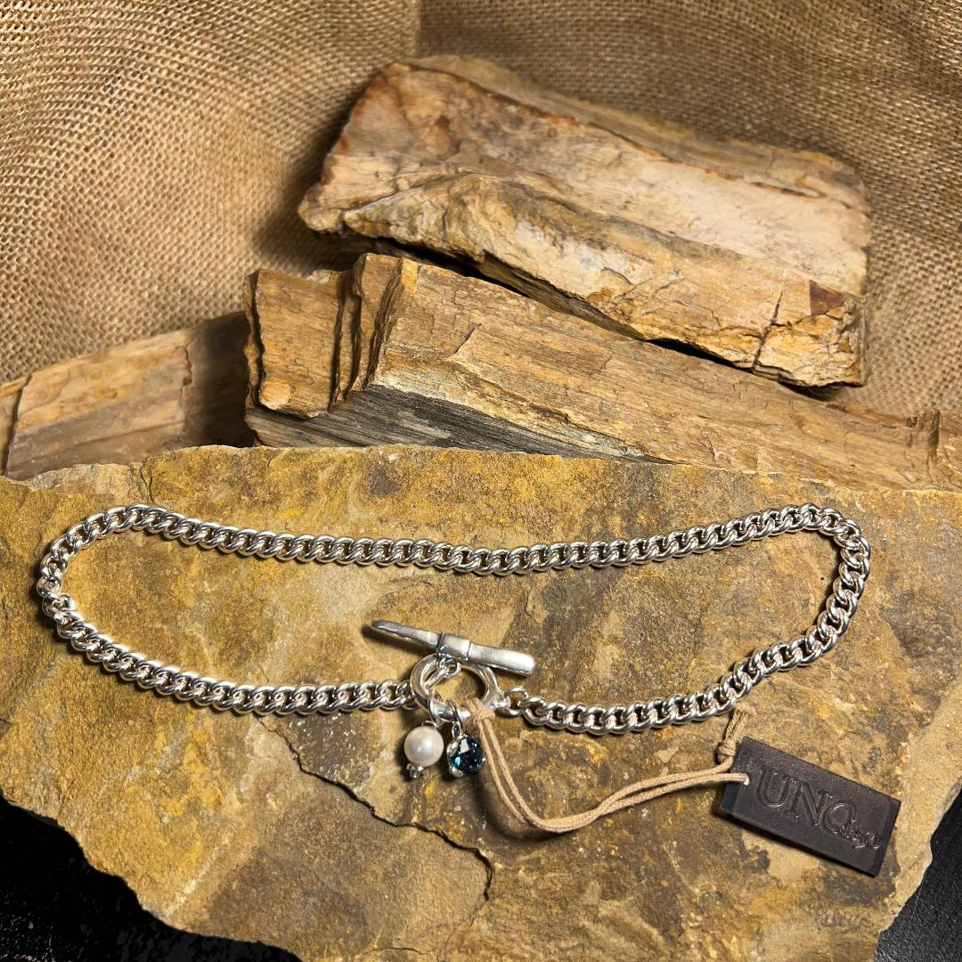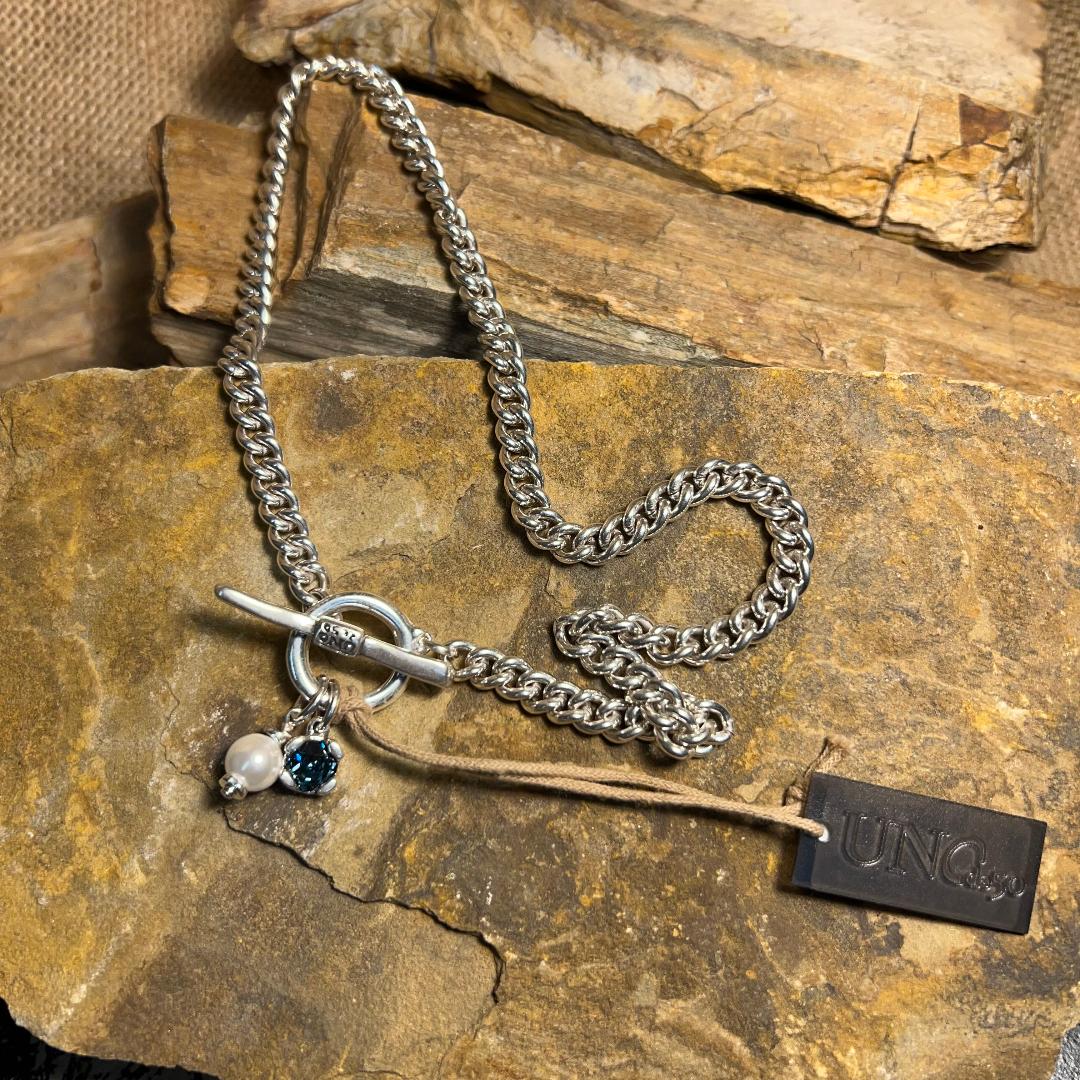 The Charismatic collection represents the ability to attract, captivate and influence everything around us, something that can only be achieved in a natural way. This is manifested in this chain necklace with two charms composed of a pearl and a blue faceted crystal with an original ring and bar clasp. A true fusion of art and jewel in a single piece that makes you dream. This jewel is Made in Spain, 100% handcrafted, achieving a unique design finish.