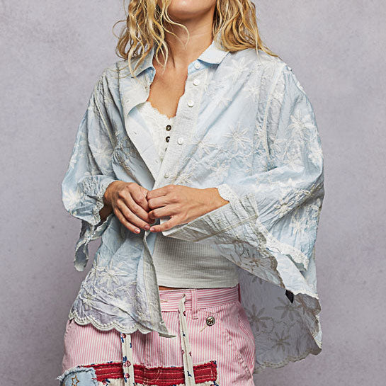 A relaxed-fit shirt with half-length sleeves, a classic collar, and a clean button placket, made from fabric with floral embroidery and finished with scalloped edges.