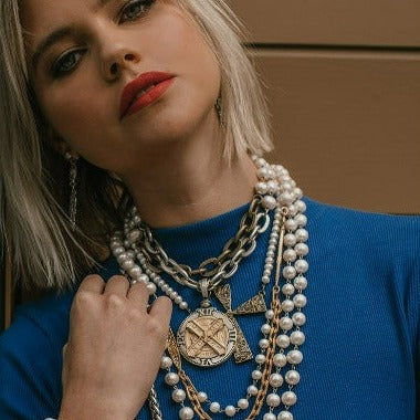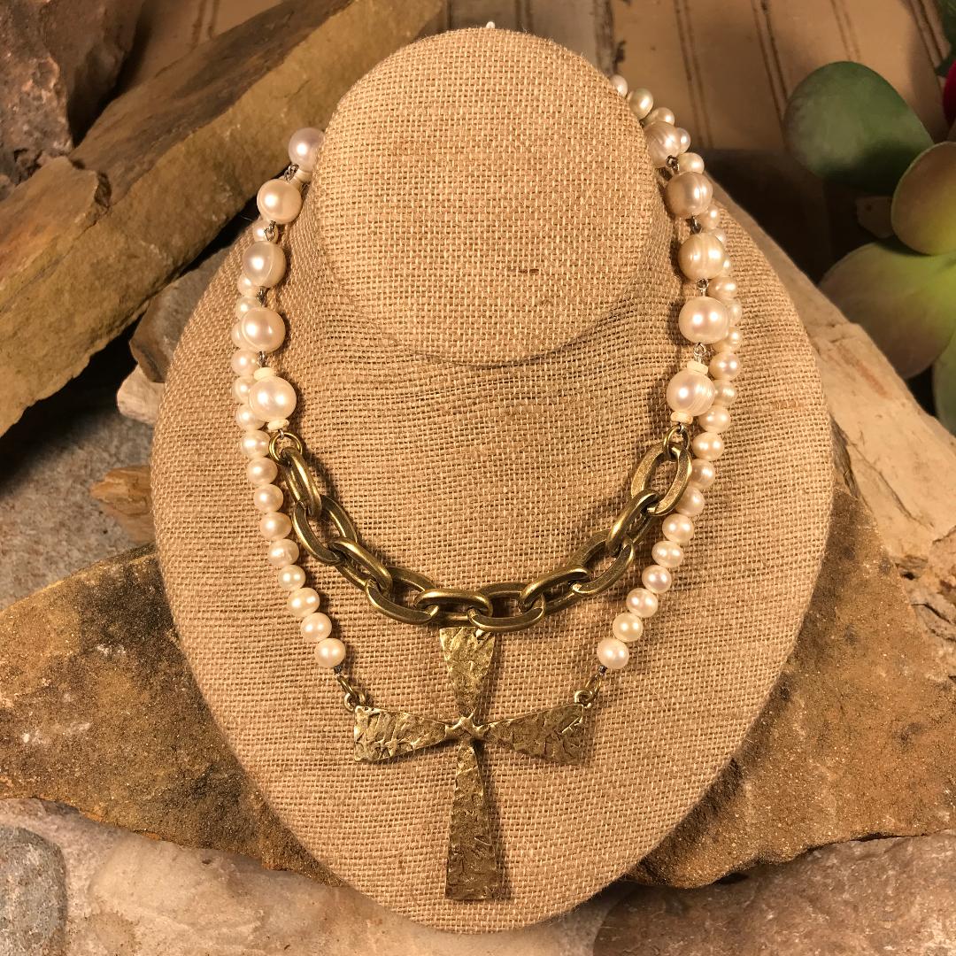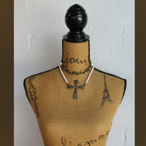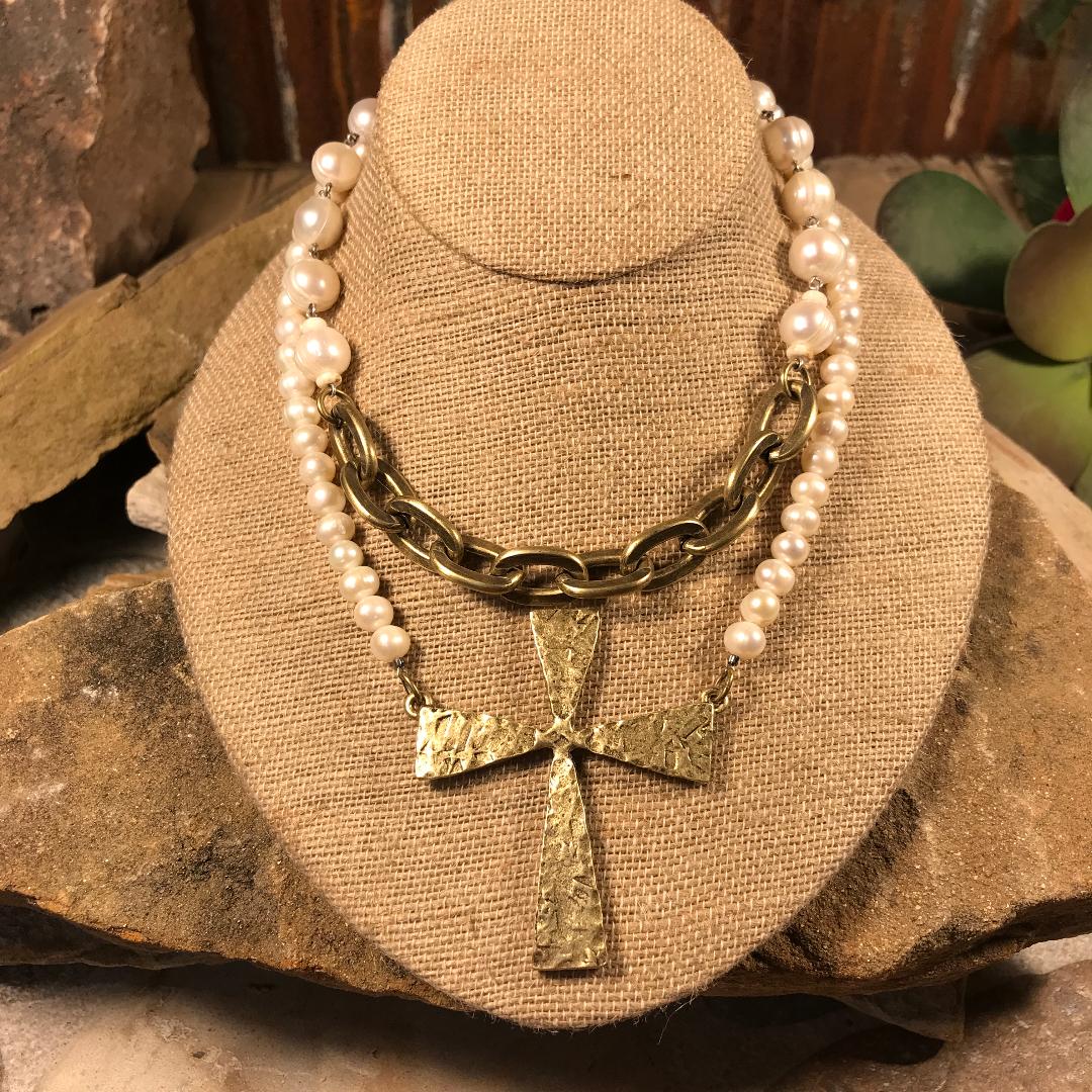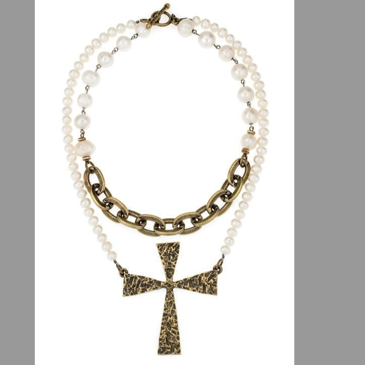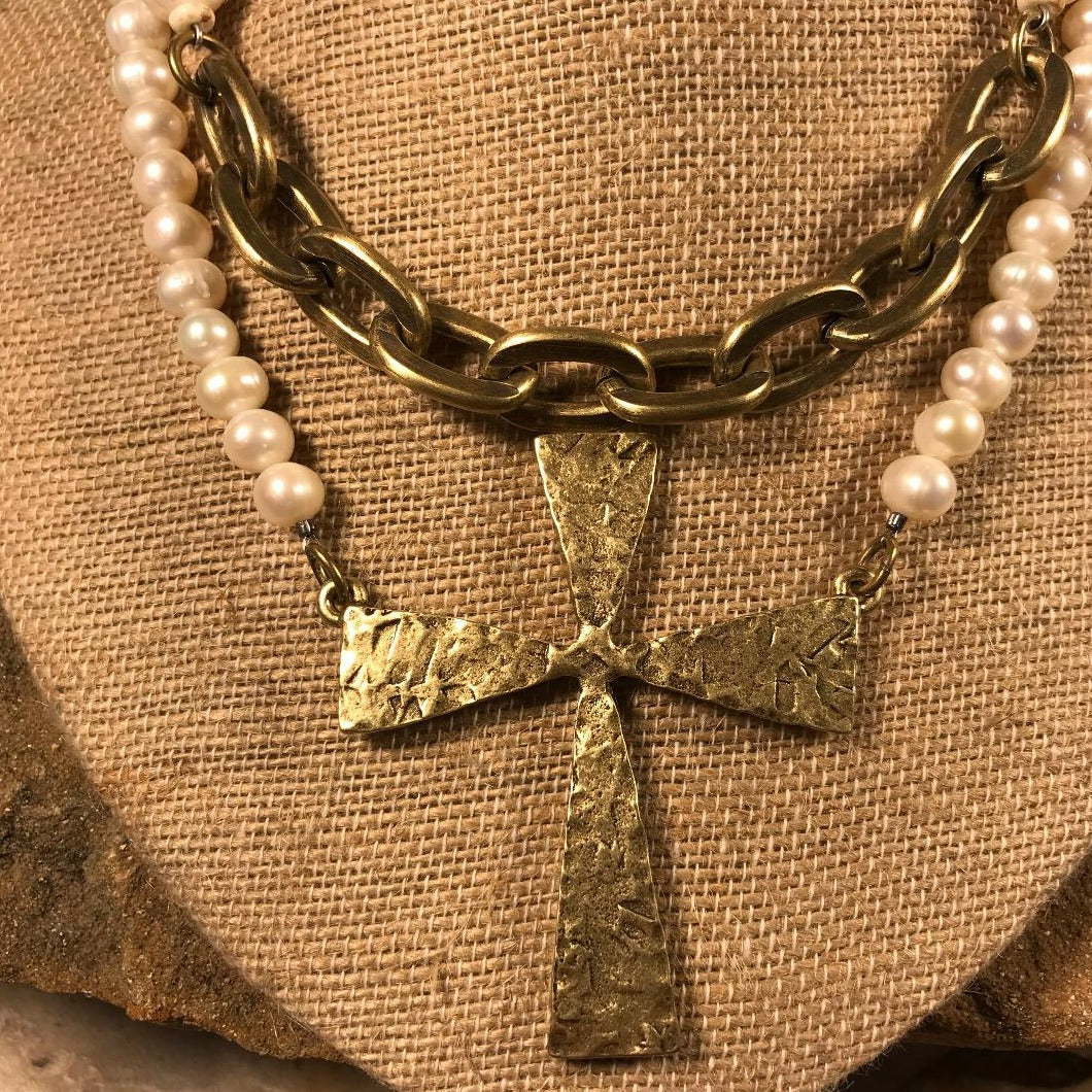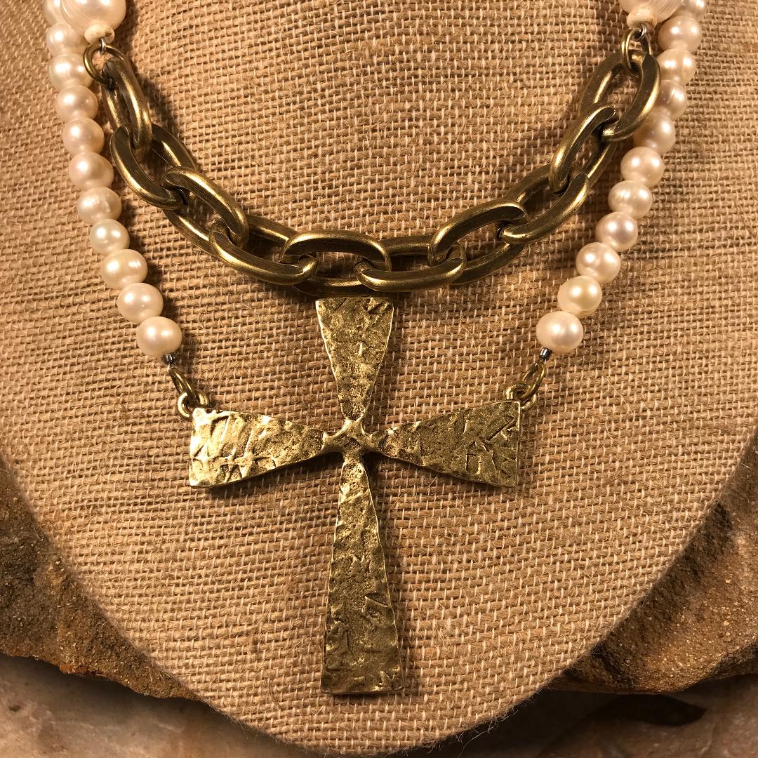 This necklace features 15.5” of white Freshwater Pearls with silver wire, our Lourdes chain and our very bold French Cross. Absolutely beautiful all by itself or layered with our other designs.